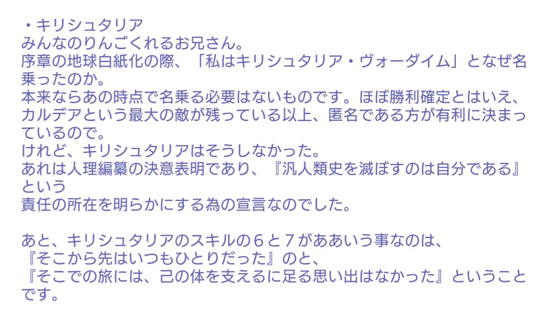 あれはペンテシレイアじゃなくてアルテラ真体といえば、キリさんの「少なくとも私については、記録領域は正常に稼働しているようだ」に対して