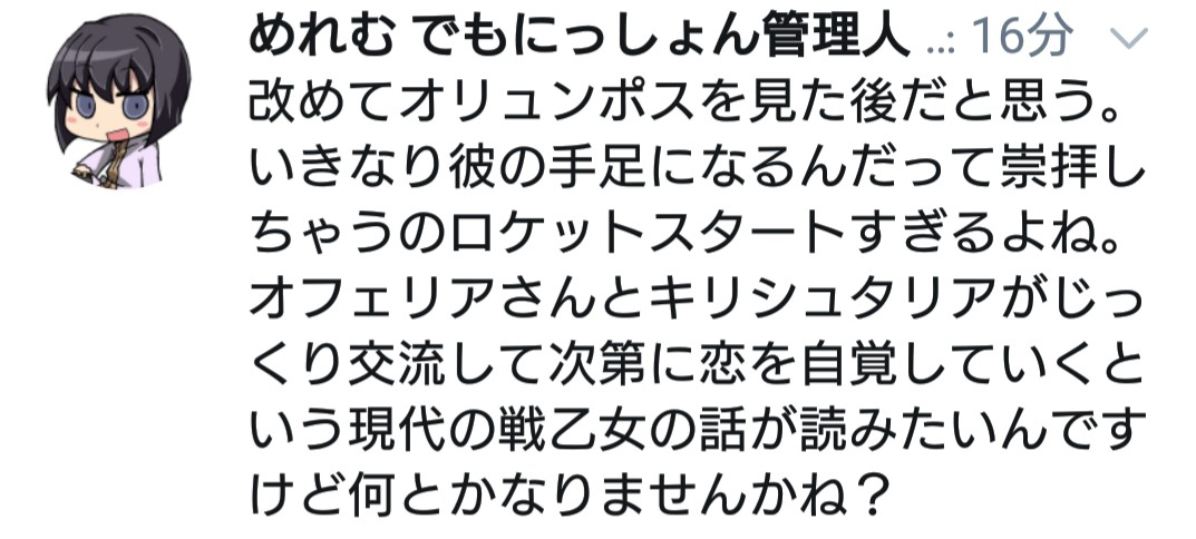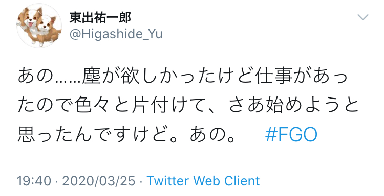 https://twitter.com/fgo38195272/status/1251907931160756232?s=21(おや…もしやヤンデレめいた方向に舵を切りはじめてらっしゃる?)