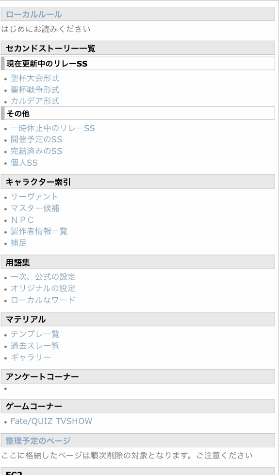 このスレッドはでもにっしょんch発リレーSS「Fate/TV SHOW」シリーズまたは「聖杯大会本戦総合」を円滑に運用する為の雑談場所、相談場所になります。新規参加者大歓迎!!!