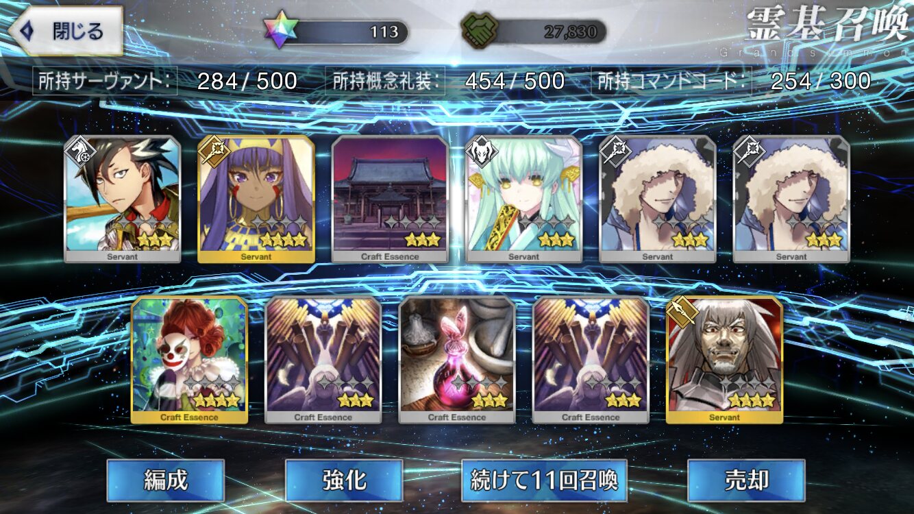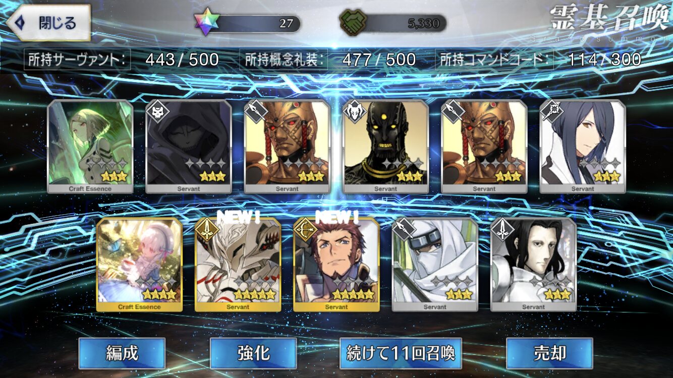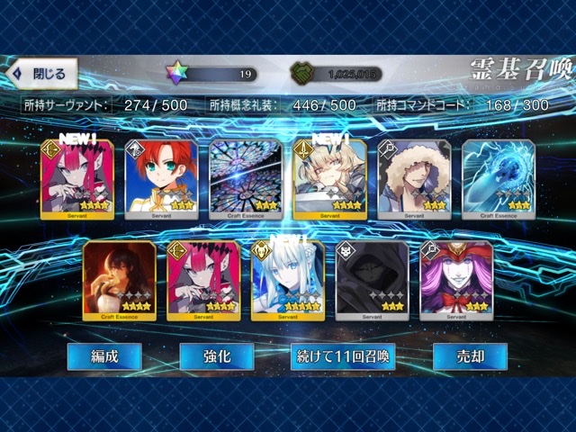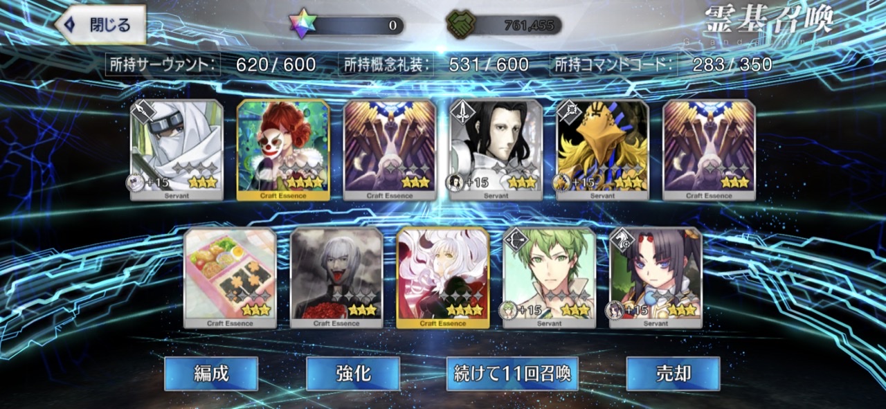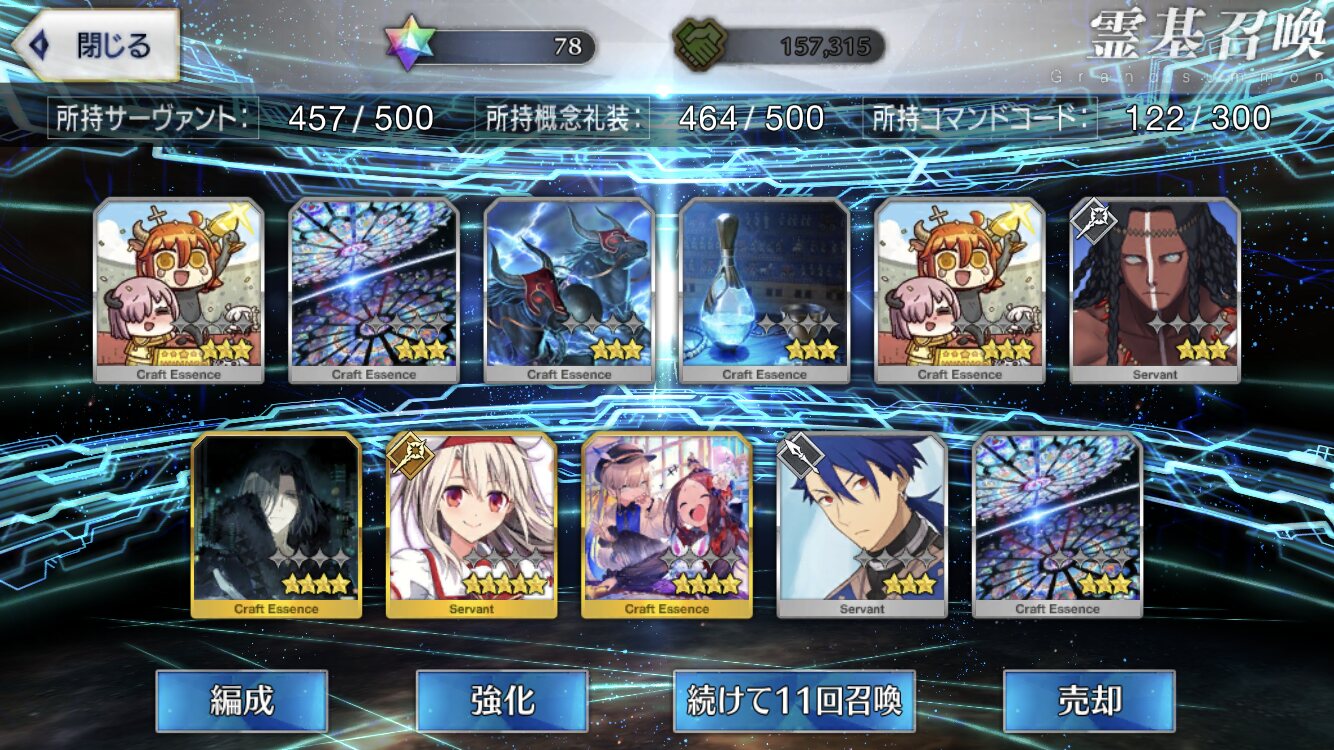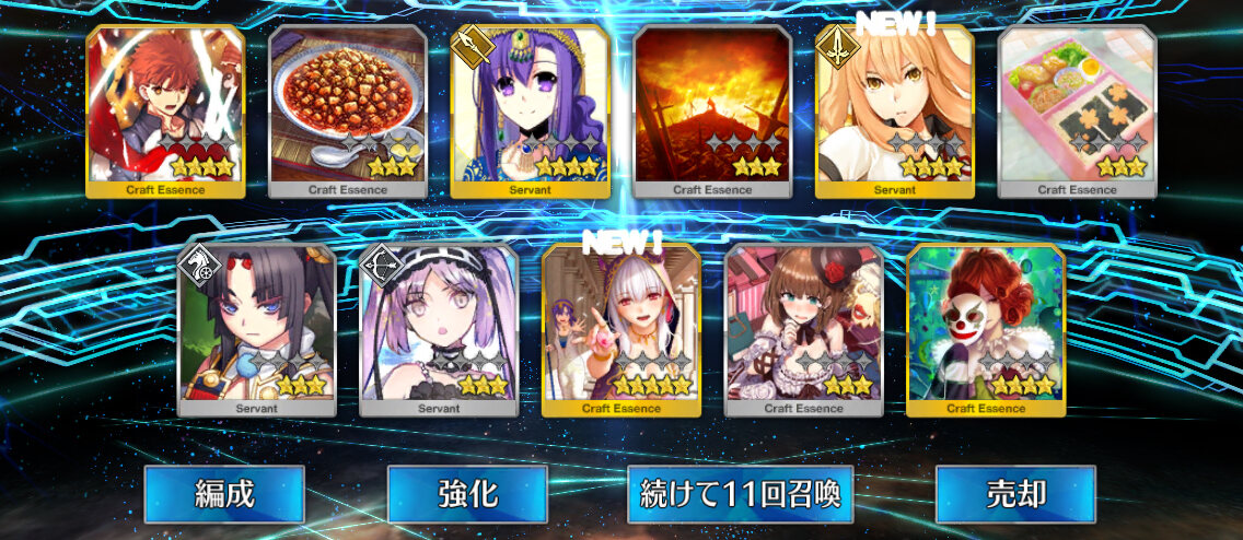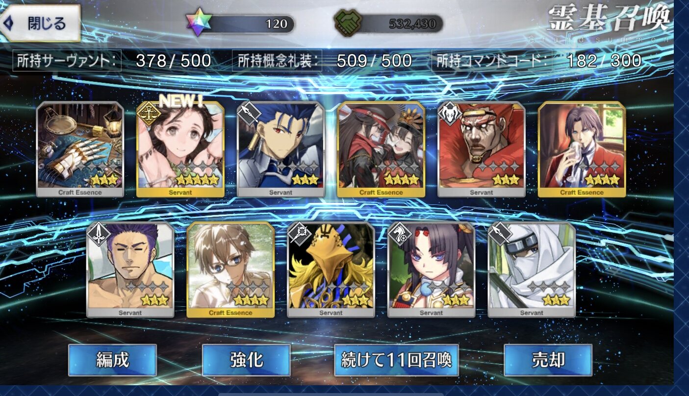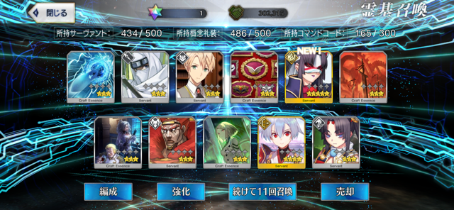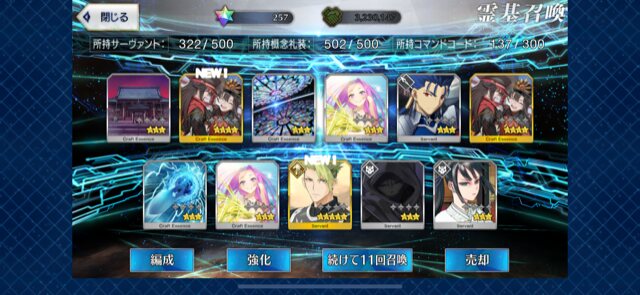 柳生さんの宝具か上がったので良しです画像撮り忘れてしまったが、出血覚悟の最後の11連でカーマとラーマが一緒に来るというダジャレみたいなことが起こった······
