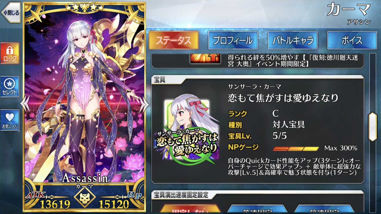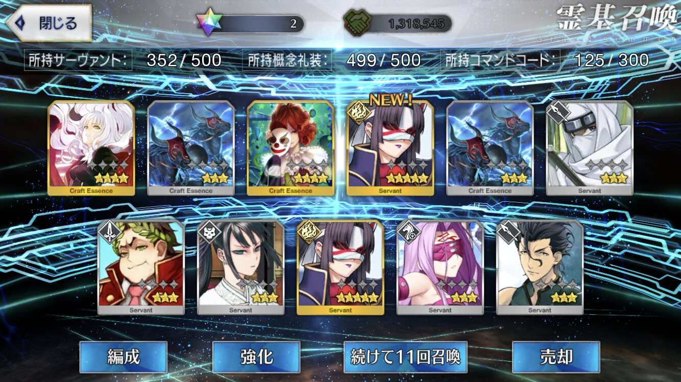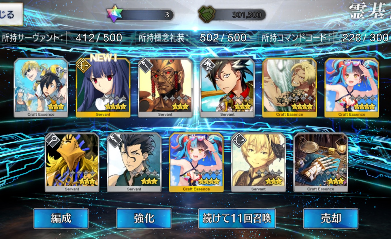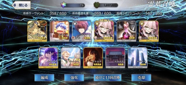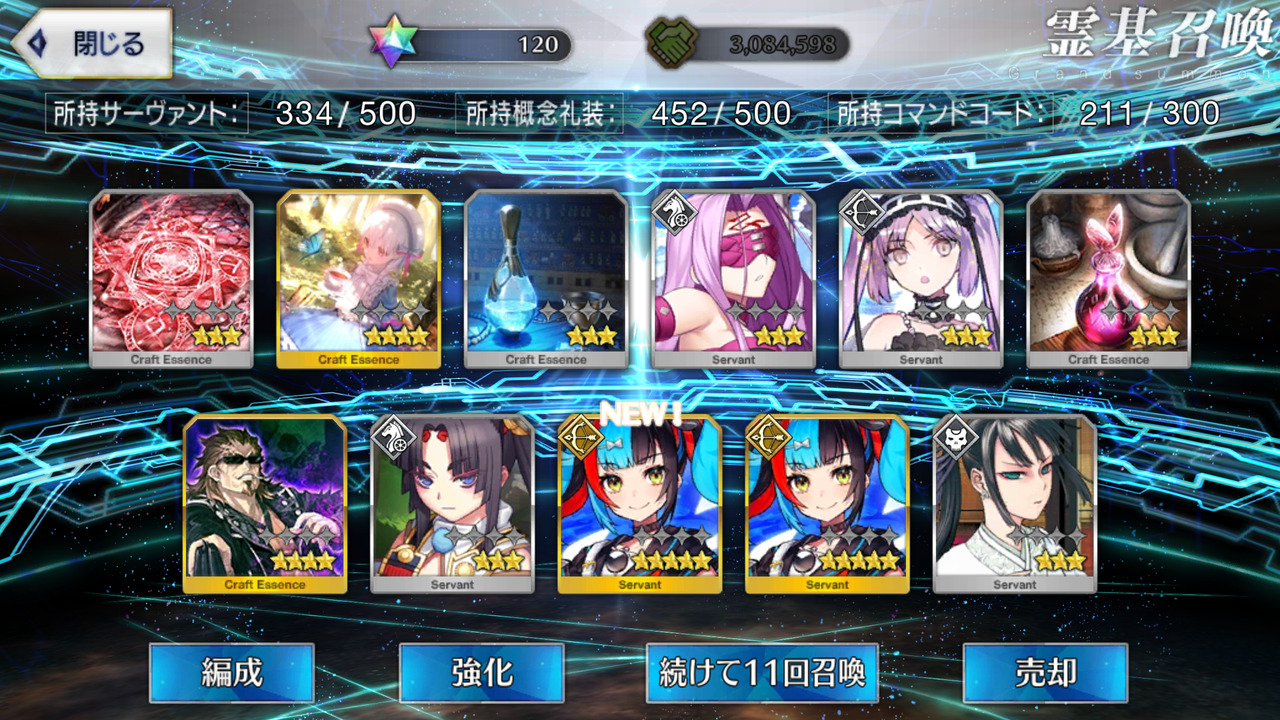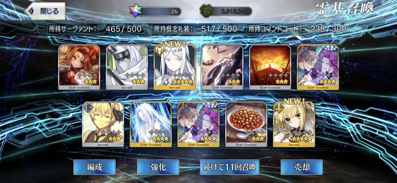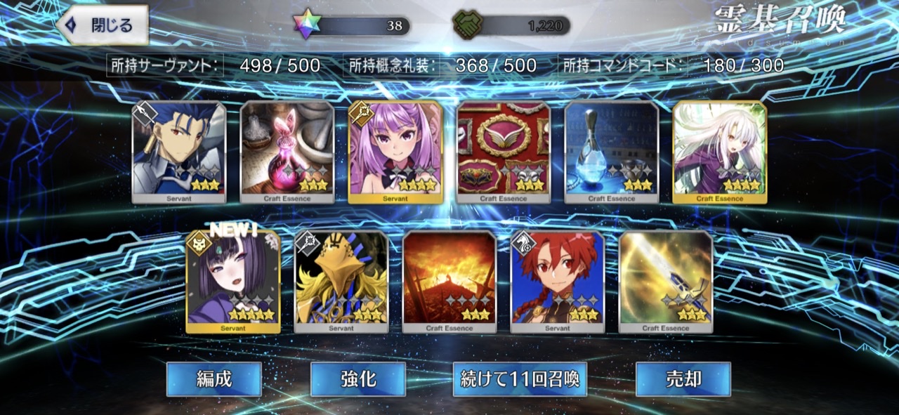 柳生さんの宝具か上がったので良しです画像撮り忘れてしまったが、出血覚悟の最後の11連でカーマとラーマが一緒に来るというダジャレみたいなことが起こった······