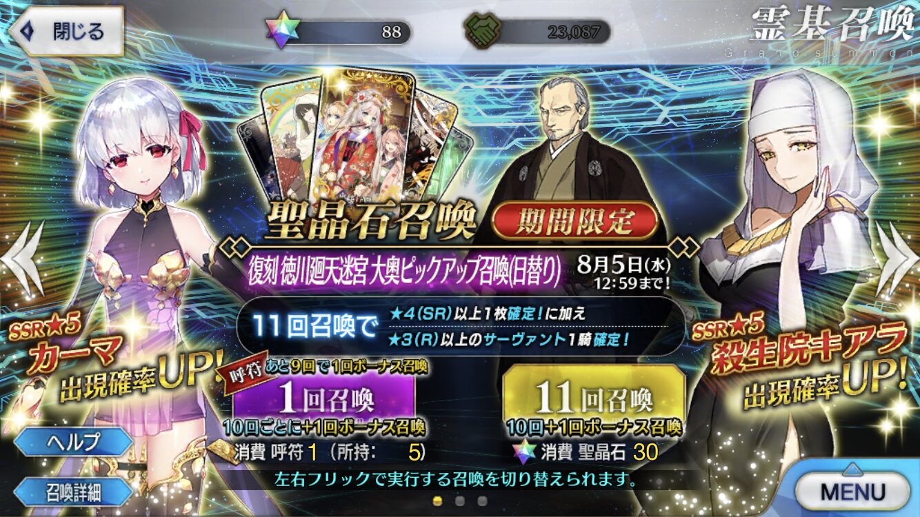 今回は大勝利、呼符10枚でカーマも柳生さんも来た