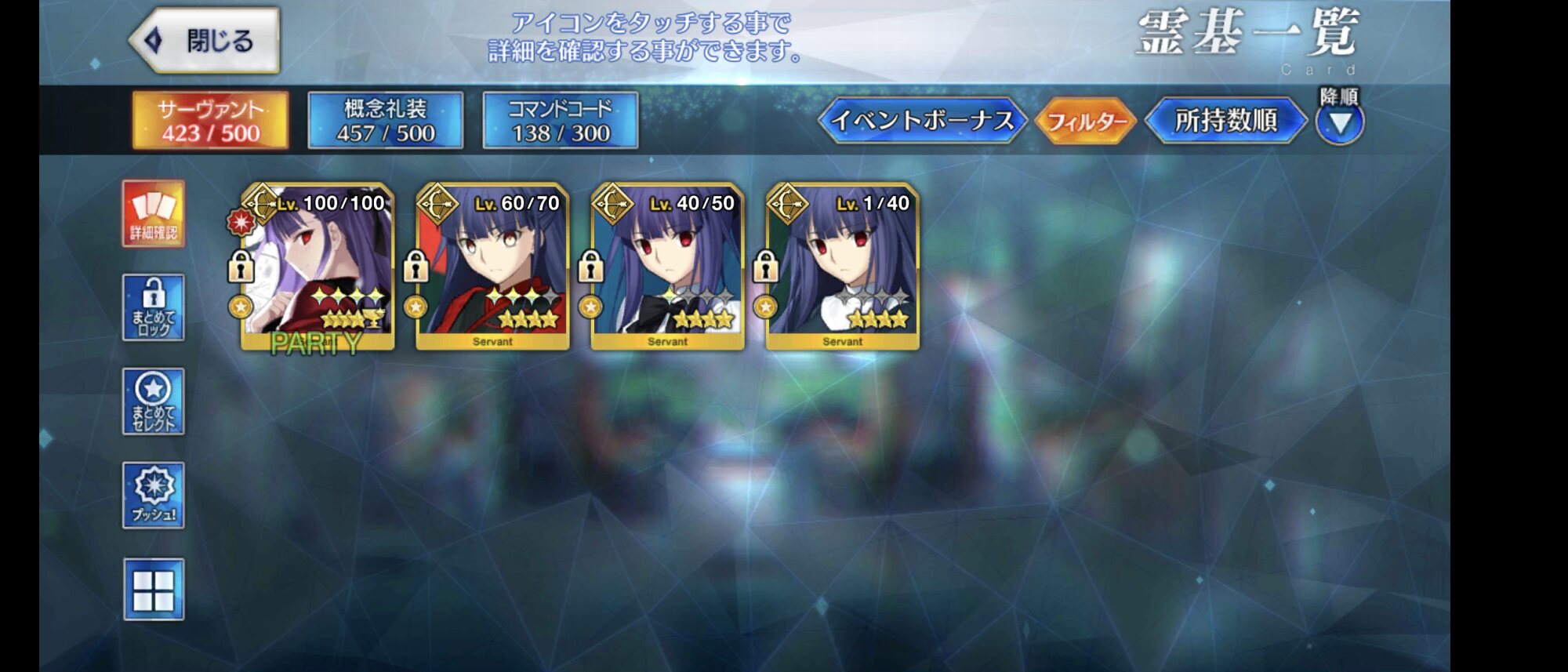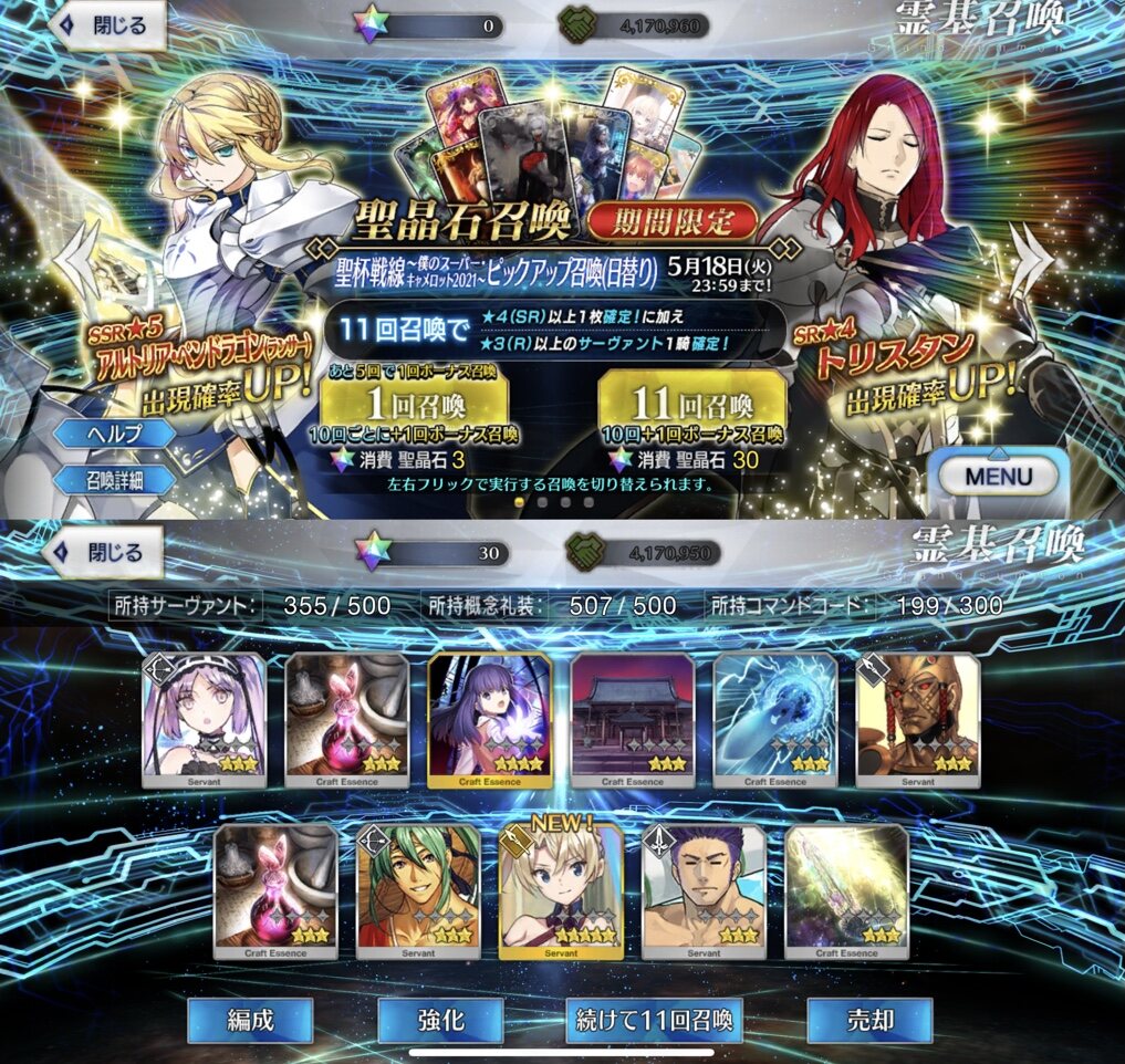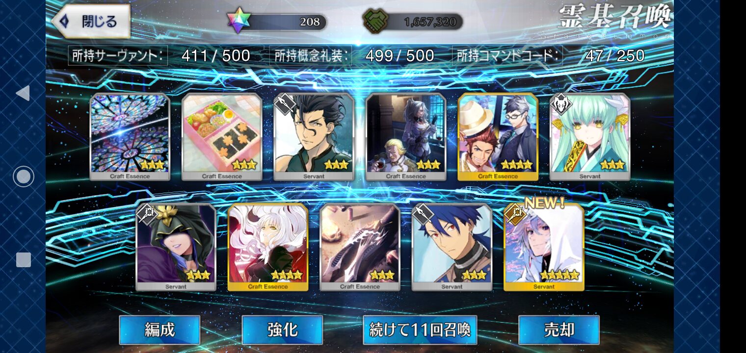 ・・・うん、その前にすり抜けなしでラン子が宝具5になったのは予想外だったのね。課金ほぼしてないのに。モルガンもバゲ子トリ子が来る前に宝具5になったし、どないなってるの?11連で2人とも引けたのにパーシヴァルの宝具重ねたくて深追いしたらラン子宝具3パ卿宝具1という結果