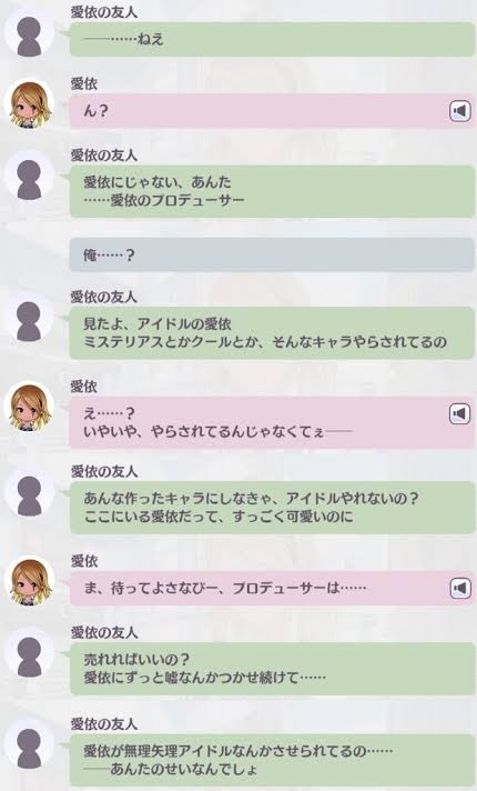 ちっひに関してはモバでシステム上の都合とはいえ「ほらほらもっと頑張って!」と言いながら原材料のよくわからないドリンク剤を売りつけてくるからまぁうん