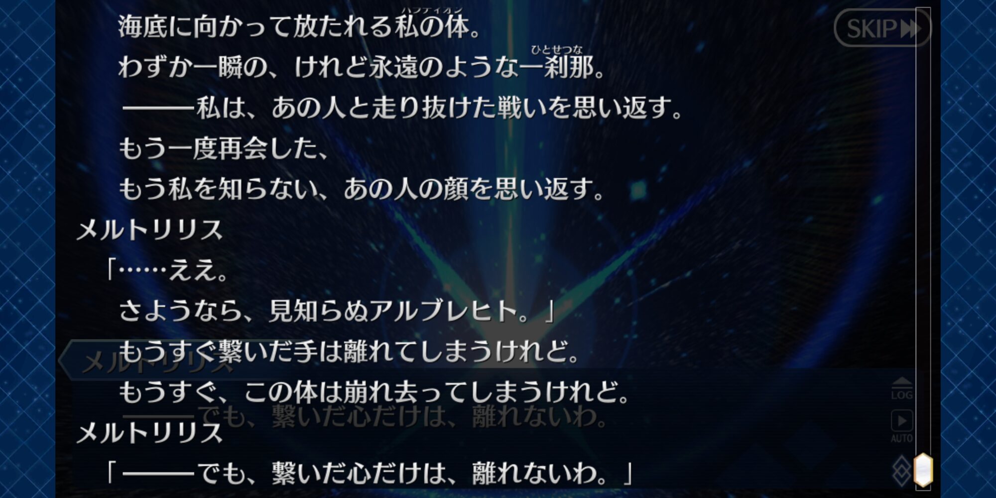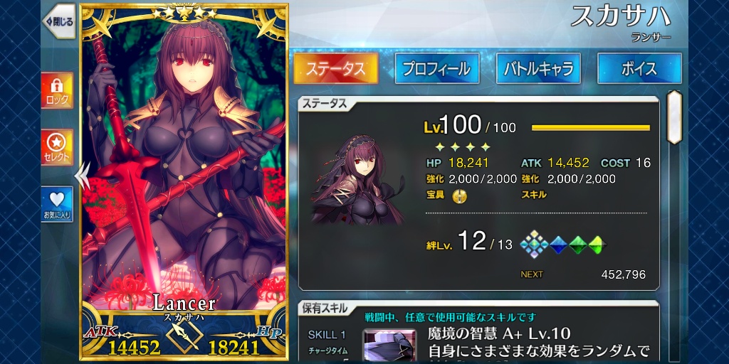 この彼岸花というのが意味深だと思う。彼岸花の花言葉は「情熱」「悲しい思い出」「独立」「再会」「あきらめ」だ。弟子には魂が腐ったと言われたこともある彼女だが、カルデアに召喚されてから心に生気を取り戻した彼女の在り方からも彼女は情熱的な人柄であったと推察できる。彼女が死から遠ざかった存在になってしまい、愛する人や親しい人に置いてかれてしまう境遇、そのことへの諦観と影の国の女王としての矜持から一人で生きていくという気持ちがあるように感じる。>>32