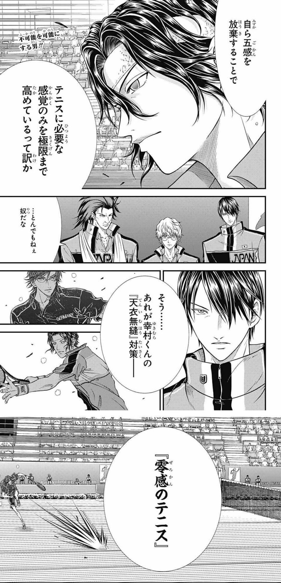 そしてテニス感のみを残した「零感のテニス」で、手塚のスマッシュをかつての越前のドライブと重ね合わせて見事に返球し、トラウマを振り払う