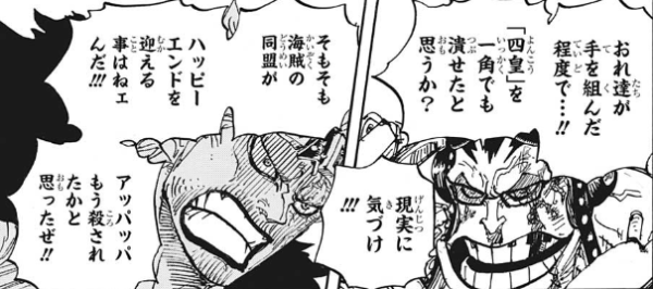 それを実行できるくらい頭いいしな狂死朗親分はゾロの二刀流を抑えたり、四皇の(傘下の傘下だろうけど)船切ったりとワノクニのサムライが強いことをちょくちょく示してくれるから好き。