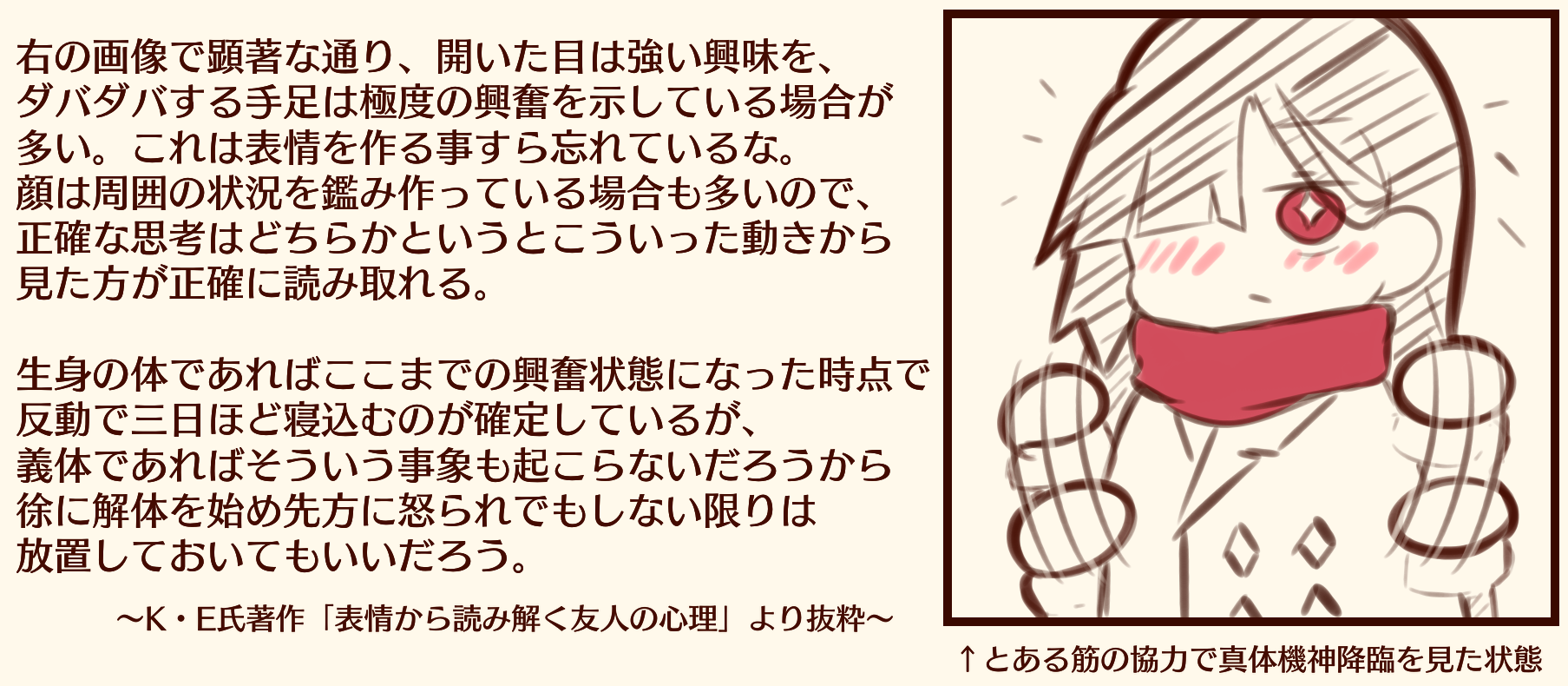 心理学的な、あるいは生理学的な感情のアルゴリズムは理解していれども悲しい位に実感、体感が伴わない為、人の感情を真に理解することが絶対に出来ない。