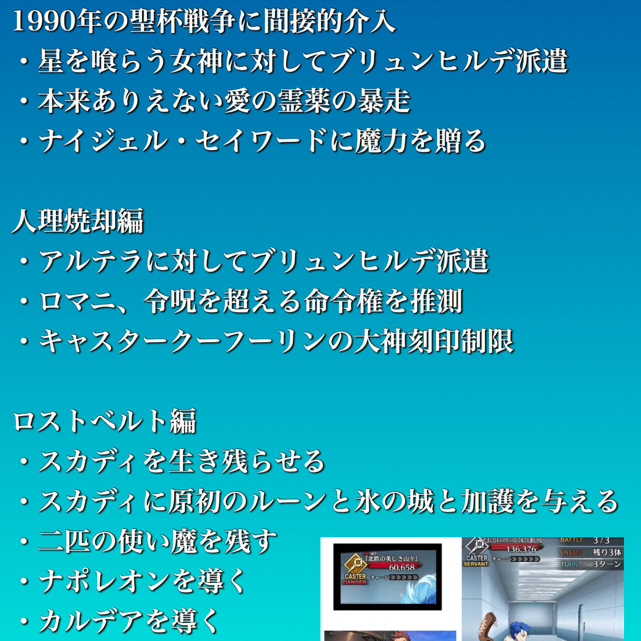 人類史をやり直したいのは異星の神と同じ。されど異星の神もギリシャの神々も必要とはしていない。おそらくはアニムスフィアの冠位指定を行使できる神代の特性を持って根源に到達、根源からの無限の魔力をリソースとして究極の循環社会を生み出すつもりか?(汎人類史は無駄が多いとの北欧での発言から推測)