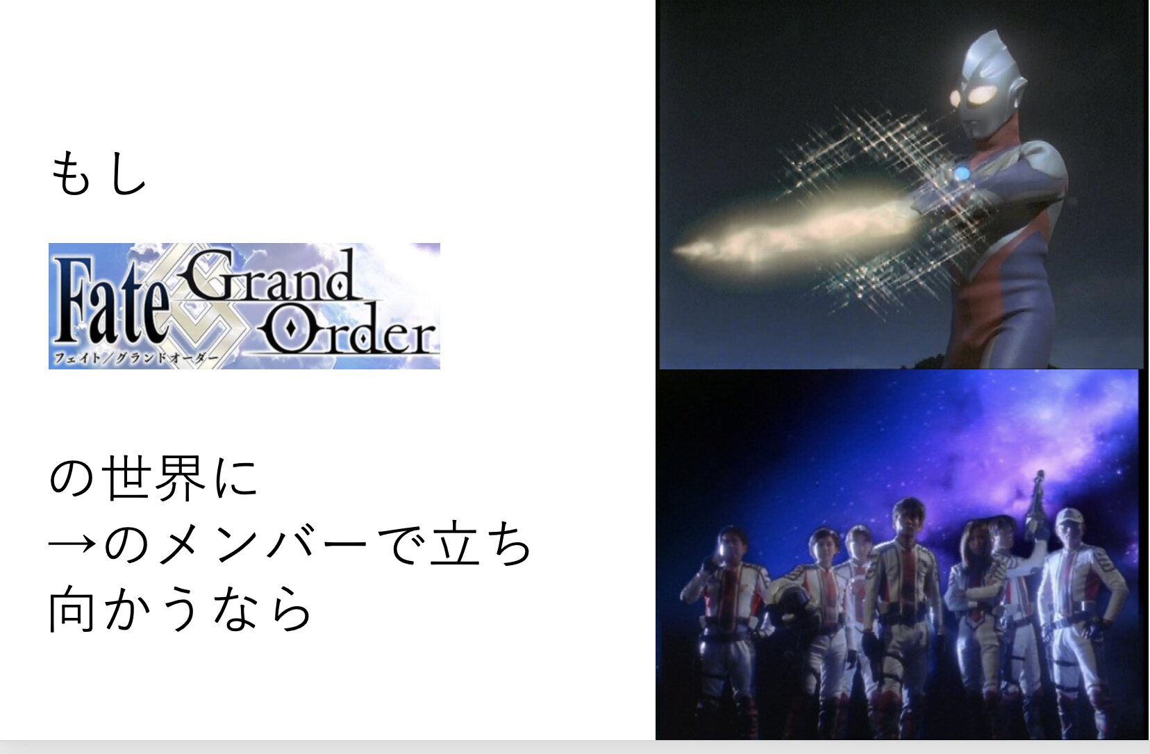 このスレは型月作品と特撮作品を絡めてみんなでワイワイやるスレッドです。短編SSや特撮実況・感想もOKです。