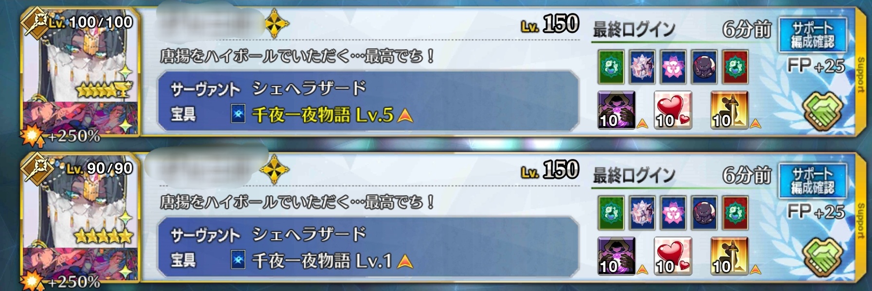 おれは しょうきに もどった!あっ、あとサポ欄をレベル100で埋めてる人は素直に凄いと思います(レベル100が一部クラスに偏っている系マスター)ふむ、見てると久しぶりにフレ募したくなるわね。まあ、枠3つぐらいしか空いてないのだけど…