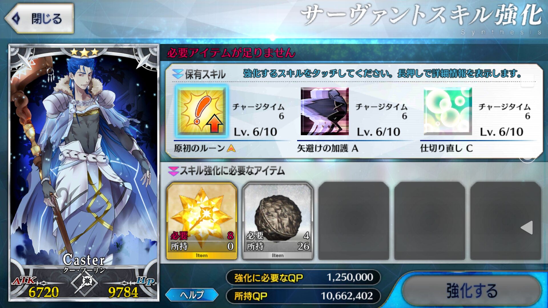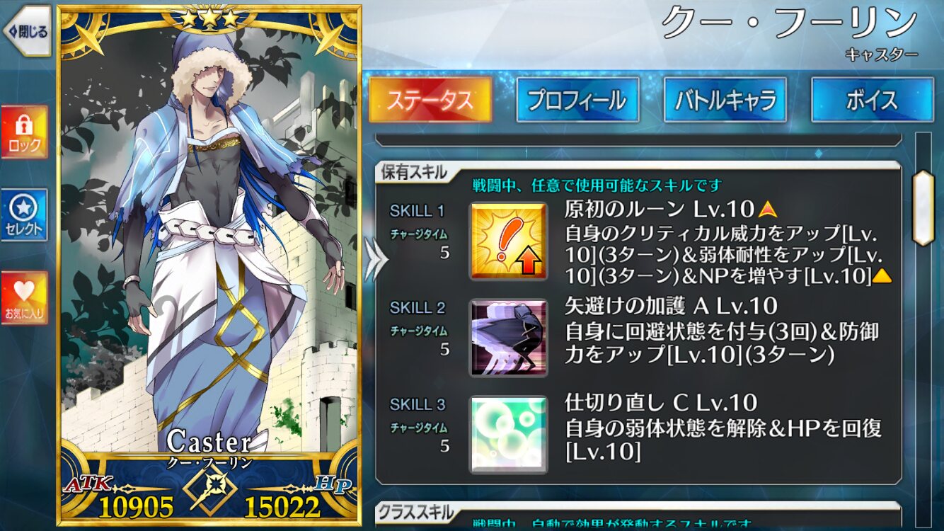 うちのキャスニキは宝具1だけど攻撃宝具キャスターにあるまじき超絶耐久能力で様々な場面を乗り越えてきた頼れるキャスターだ!まずスキル1、クリアップに弱体耐性に自前NP30。ここで宝具重なってない民にオススメなのは弱体耐性で、キャスニキはHP重視のステータスから耐久に向いてるのはおわかりだね?そこにこの弱体耐性がつくととても耐久キャスターになるのだよ。何度guardの文字を見たことか。対魔力を持ってない弱体弾くキャスニキは実質女神の神格持ちなのでは?と錯覚するほどなのでキャスニキはキャスネキなのかもしれない。