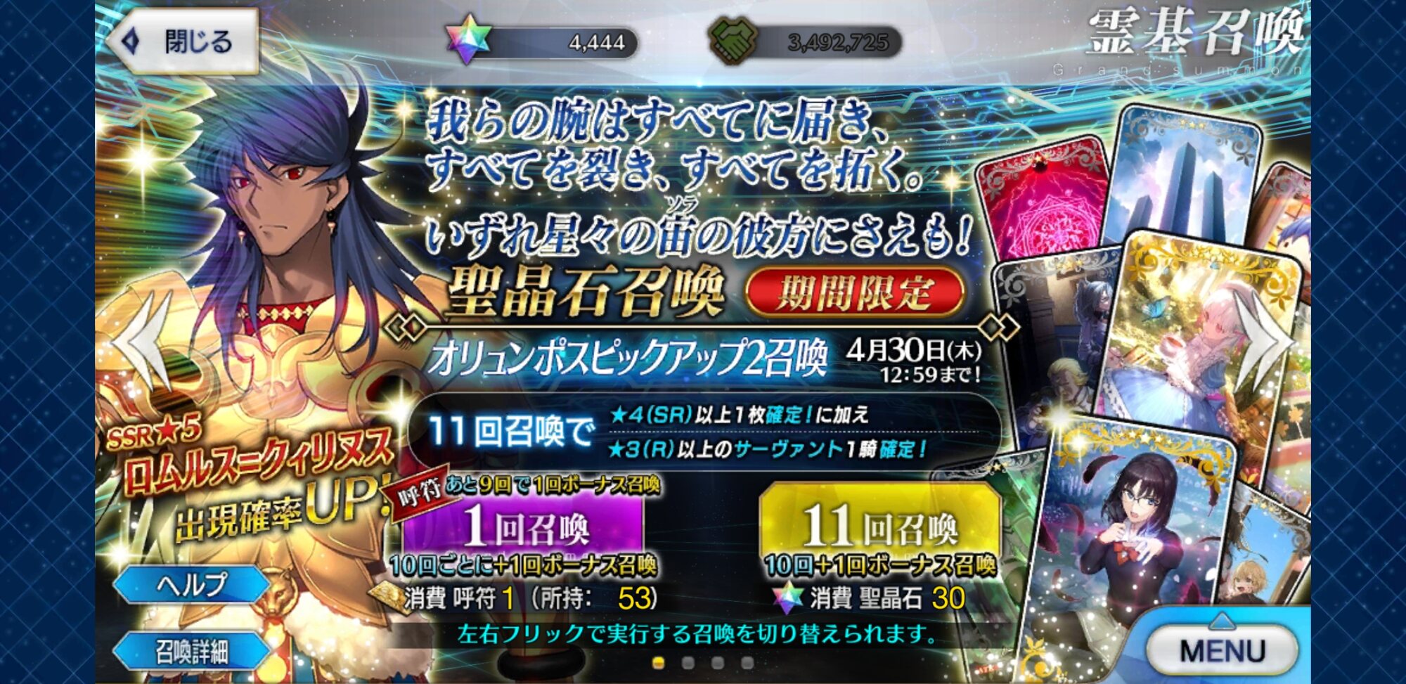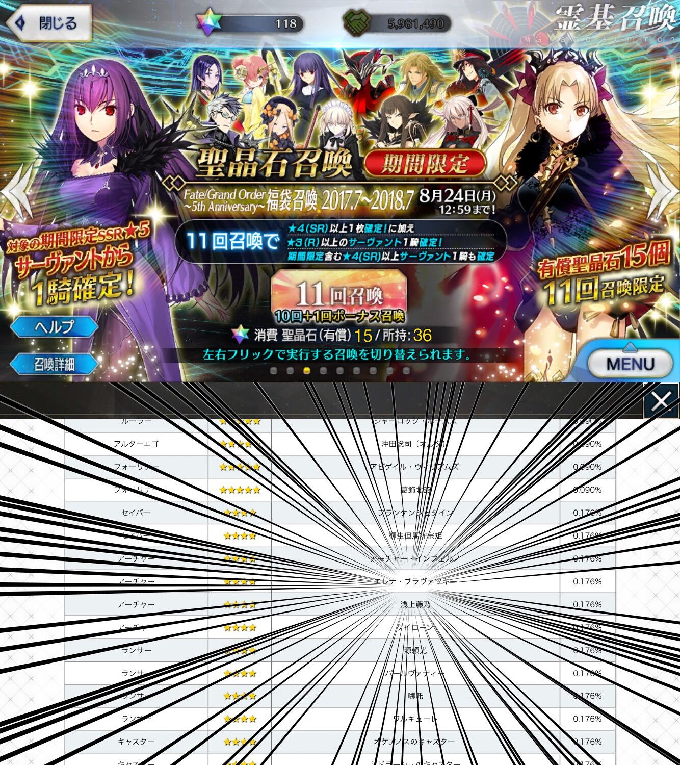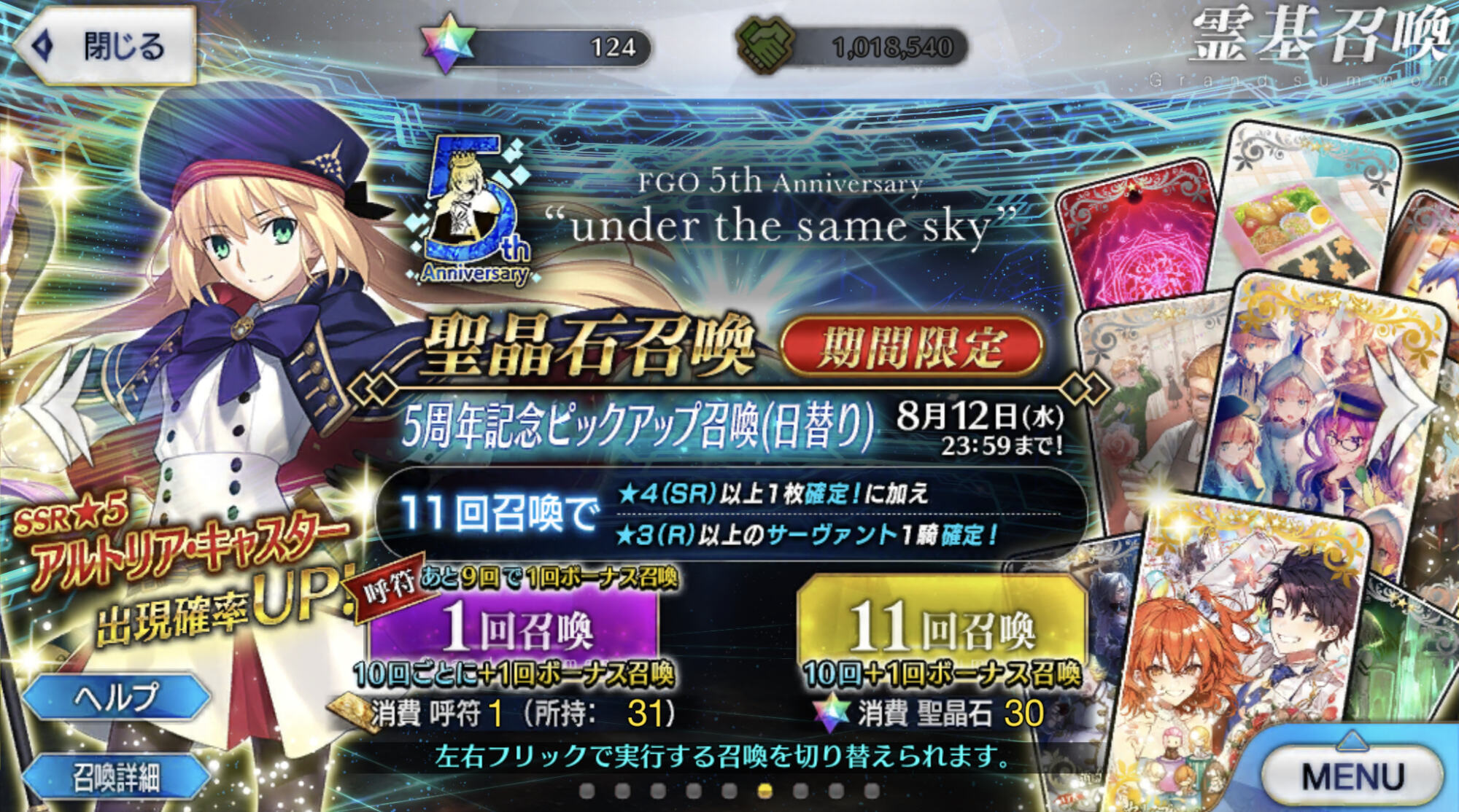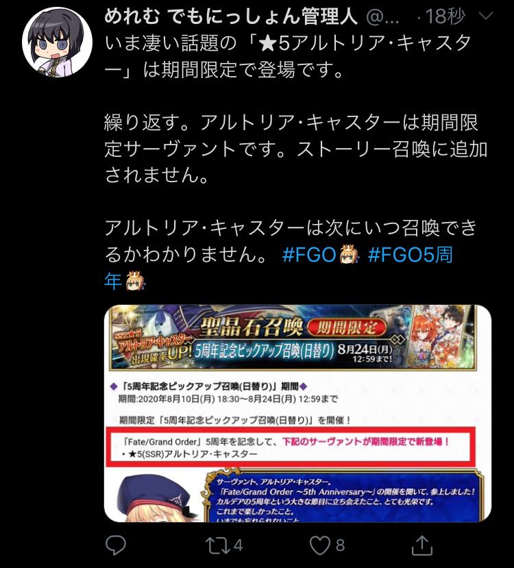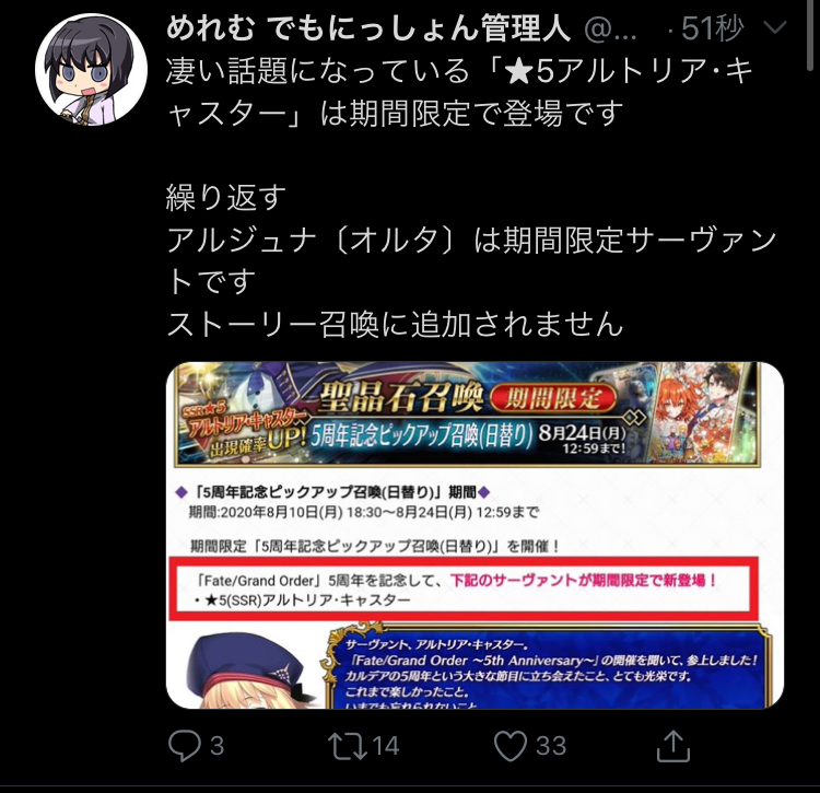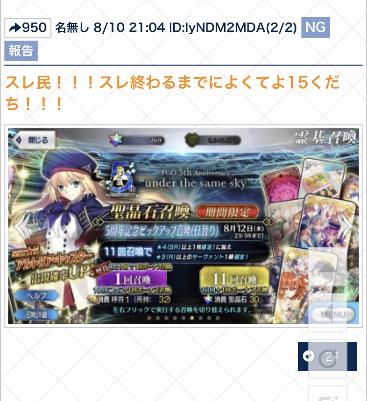 ちょっとまて全体30だと...今回のピックアップは章ピックアップじゃないな、ヨシッ!19時までによくてよ10で周年ピックアップに呼符30枚で逝きまーすッ!!