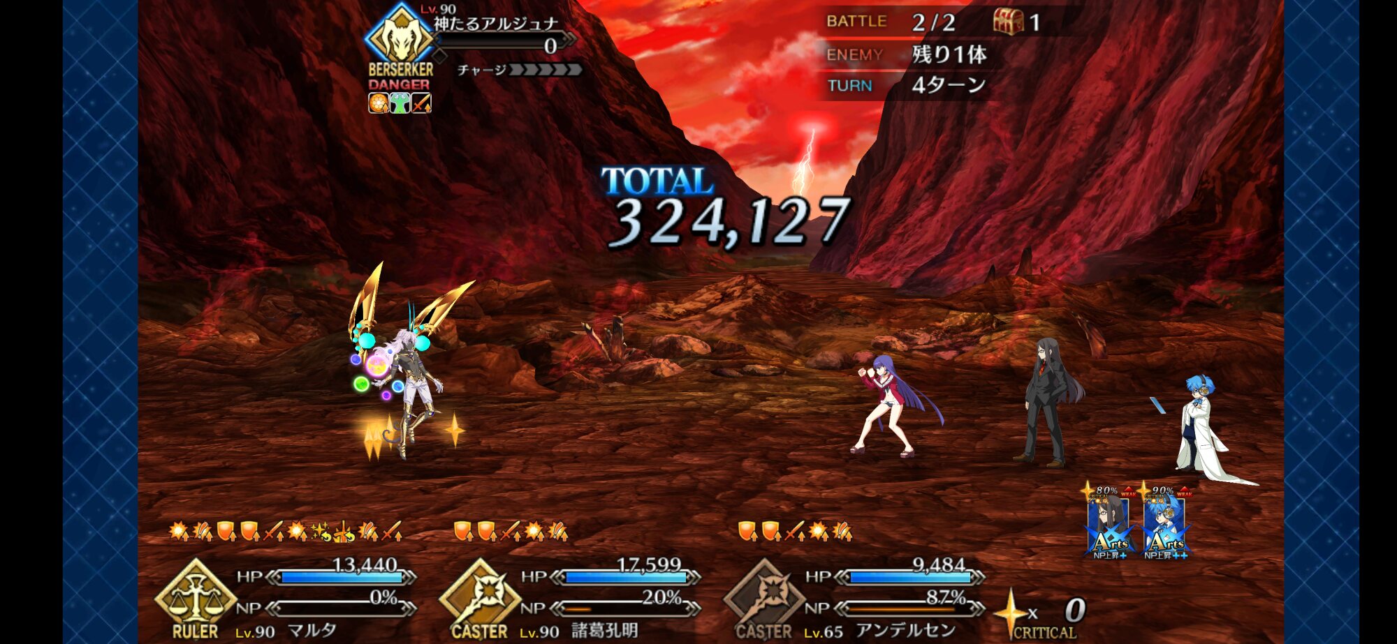 神たるアルジュナ、防御100%アップでも満タンのHPが消し飛ぶもん。クラス相性による半減だけじゃ数値が足りなすぎる。>>865