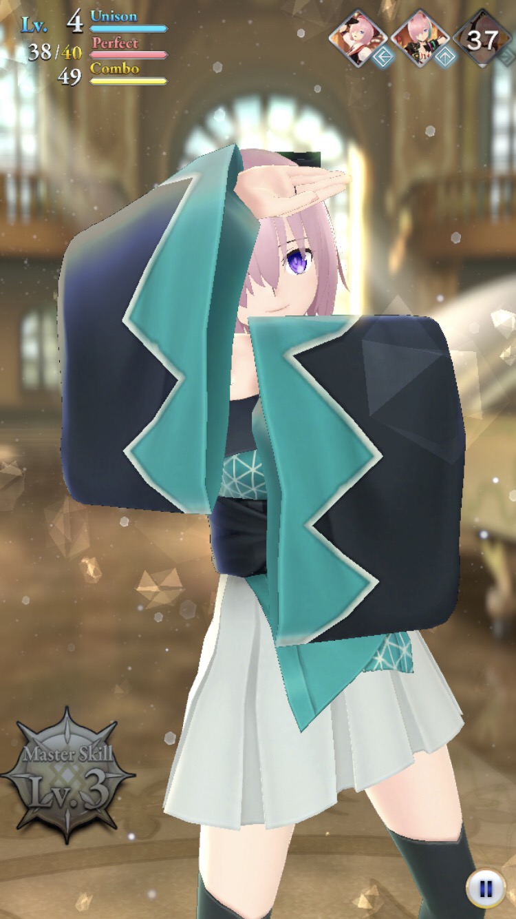 モデリングはかなり綺麗けど、時たま腕がきしめんみたいに平べったくなることが気になる一つだけ不満があるとすればユニゾンのためにノーツの位置タップしようとすると自分の指が邪魔でマシュが見えないことだ
