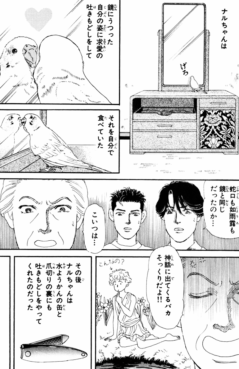 「あ~~!!娘溺泉(ニャンニーチュアン)に落ちてしまた!娘溺泉(ニャンニーチュアン)は千五百年前、若い娘が溺れたいう、悲劇的伝説があるのだよ。以来ここで溺れた者、皆……若い娘の姿になてしまう呪い的泉!!ほら見ろ、娘になてしまた!」