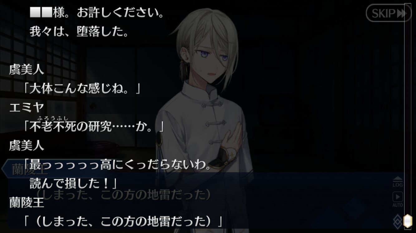 という可能性があるかも?今回一番笑ったのはダイナマイト虞美人に吹き出す蘭陵王だった