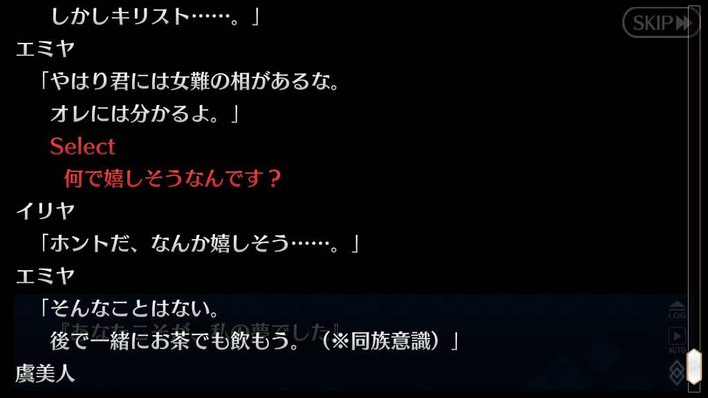 一応言っとくと、巌窟王の夢から覚めたとき会うのは式部だから、常にエミヤ側で進んでるよ