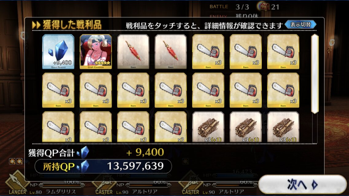 キアラ様再臨させるのイベントで敵と遭遇してからにしようと思ってたから、やろうと思えばできるな。なんとなくスッキリしてから最終再臨させたかったんだよね。またビーストとかになるならやだなと。なおビーストよりマシだったかと言うと(>>945