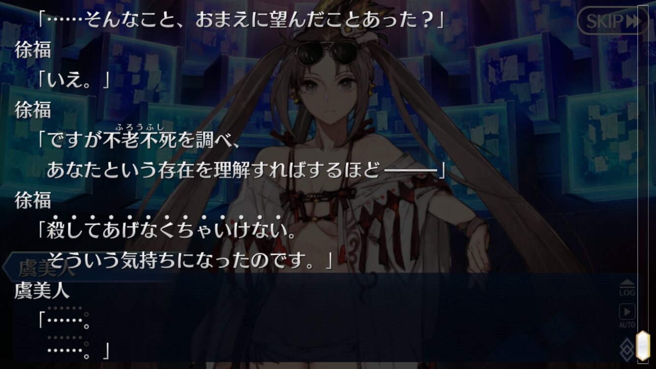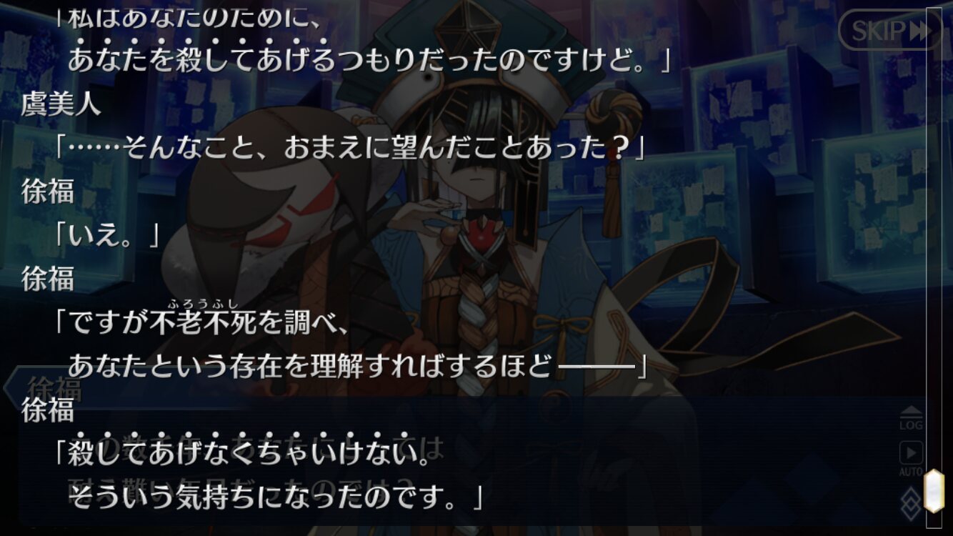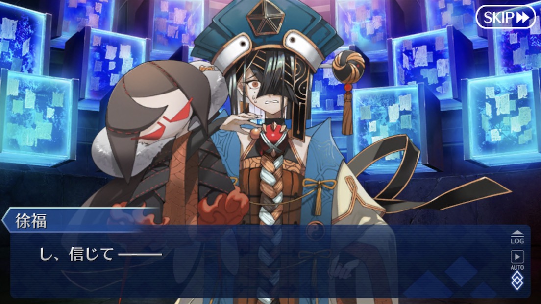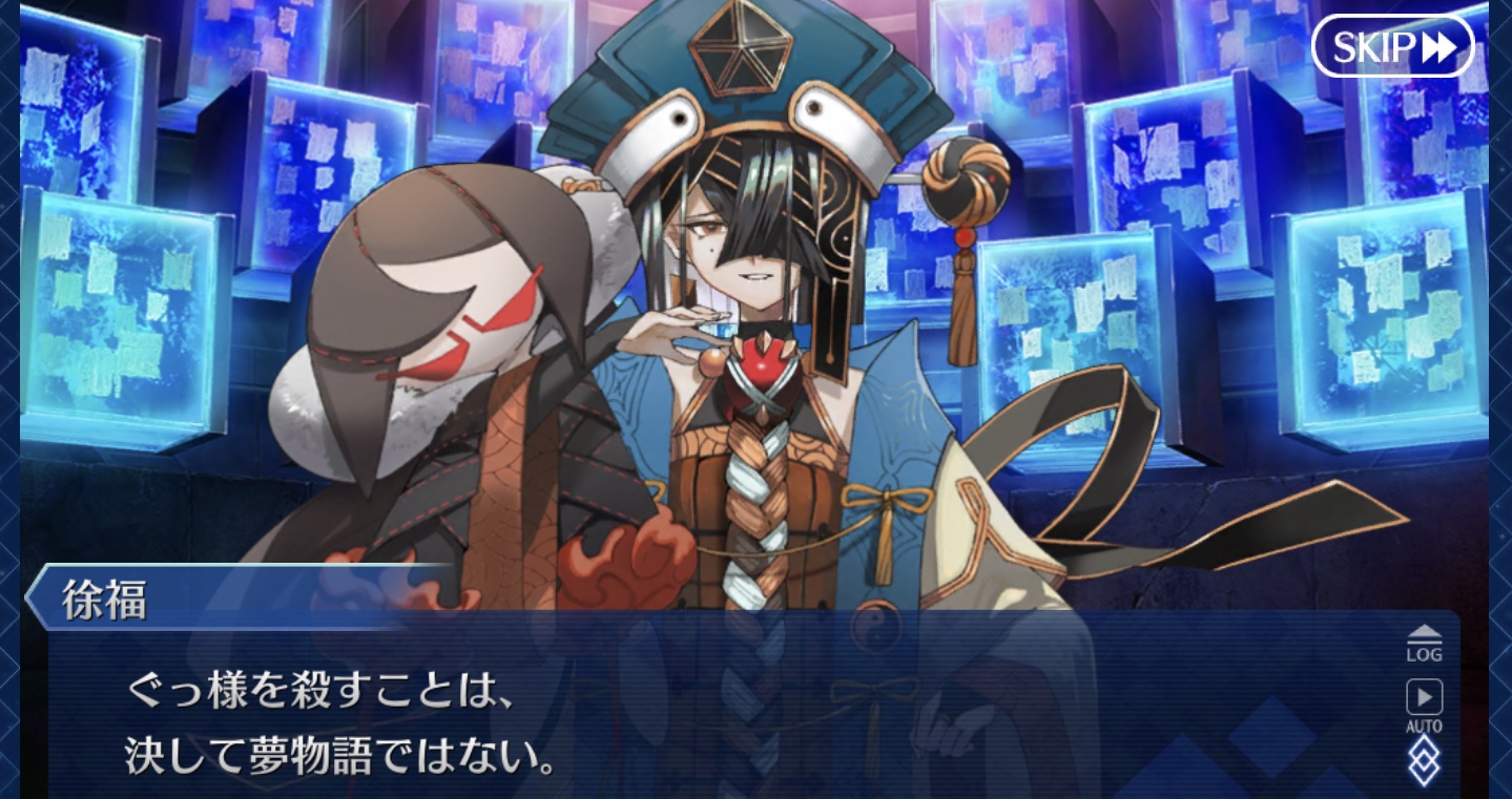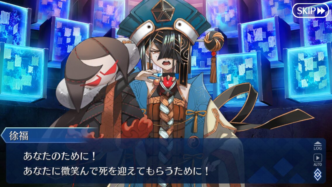 個人的には朕が派遣した徐福ちゃん(正気)とあの特異点の徐福ちゃん(狂気)に戦ってほしい……不毛な戦いをしてほしい……(歪んだ感情)これで例の仮面装着して「私は人間を辞めるぞー!」って言い出したらどうしよう、徐福ちゃん