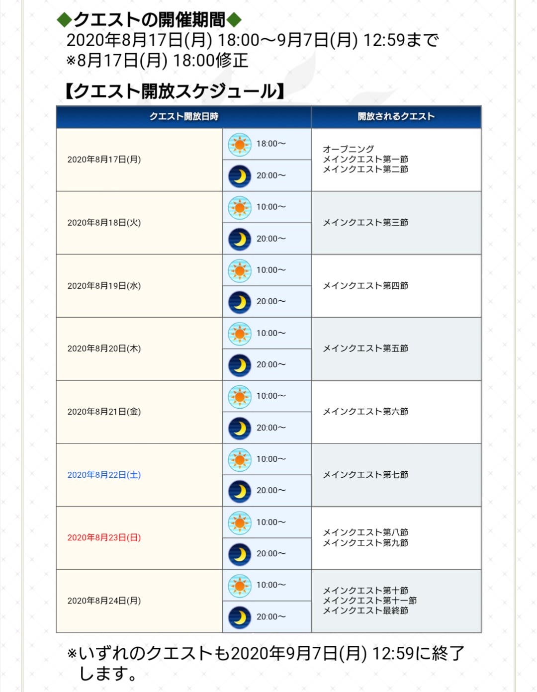 2020年8月17日(月) 18:00(予定)~9月7日(月) 12:59まで