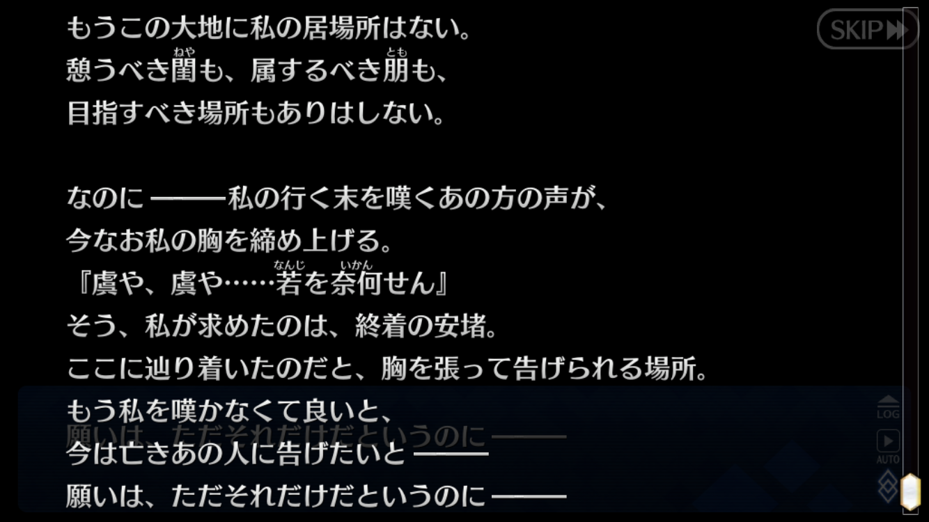 この特異点で明確な死を与えられた場合その先がいまいちピンと来てない特異点内で人間レベルの致命傷を受けるとサーヴァントであっても死'んで冥界に囚われる(トリスタン)