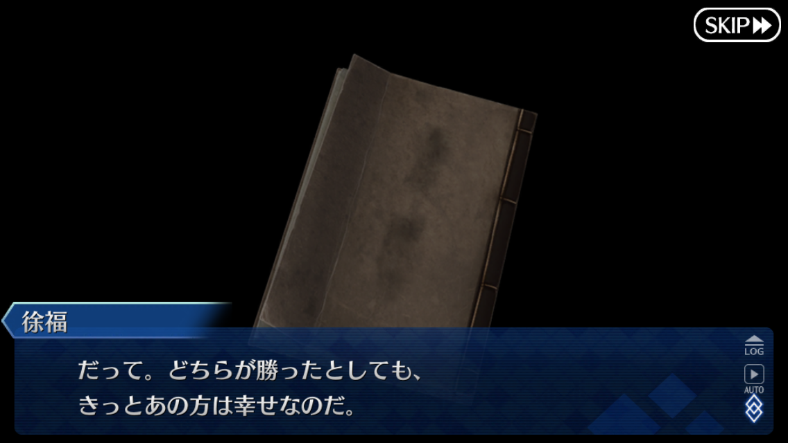 ぐだにとってマシュと一緒に過ごせる機会はこのキャンプが最後じゃないけど、ここに居た徐福ちゃんにとっては間違いなく最後の機会だしそう遠くないうちに敵同士になるから、偽物の関係でも仲良く遊んでいられるこの時間が永遠に続けばいいのにって思っちゃったんだろうなと