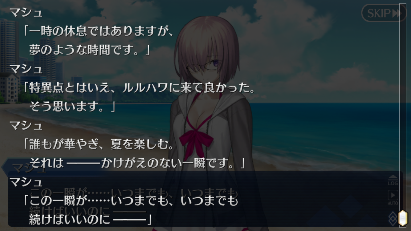サーヴァントのディープなところにあまり踏みいってなかった感じはしたよね。巴のゲーム話のとことか、本来のぐだなら少しくらいは同調の一言くらいはあったきもする特異点の名前がパラダイスレイクなあたり仮面つけた殺人鬼(殺人人形)が大暴れする気がするしリースXPがスカサハたちの船沈めた話のタイトルにプロローグとあったから多分まだジェイソンネタとサメ映画は引っ張る気がする