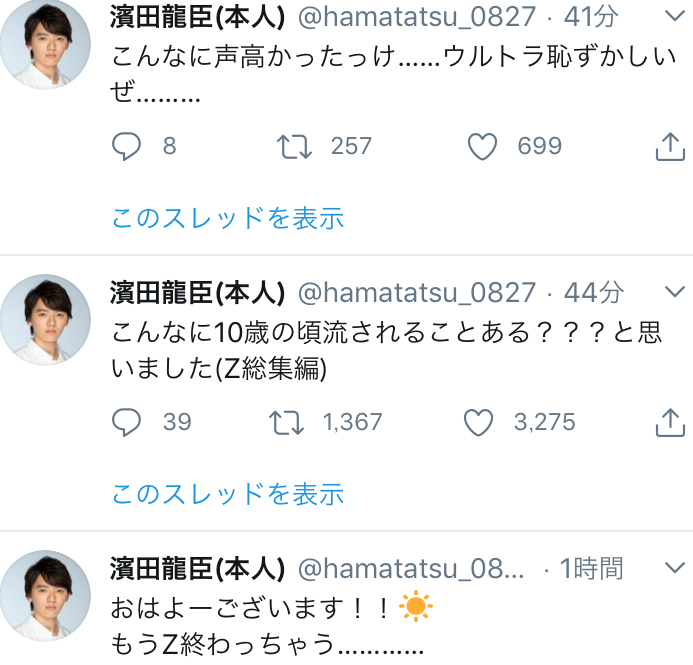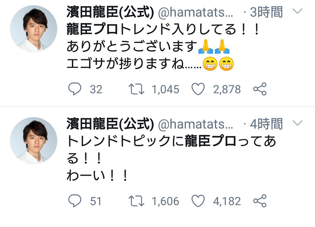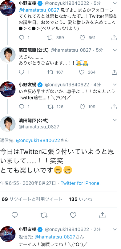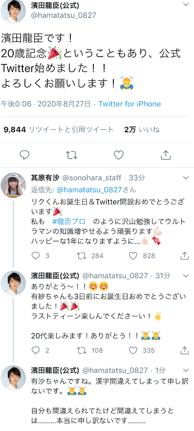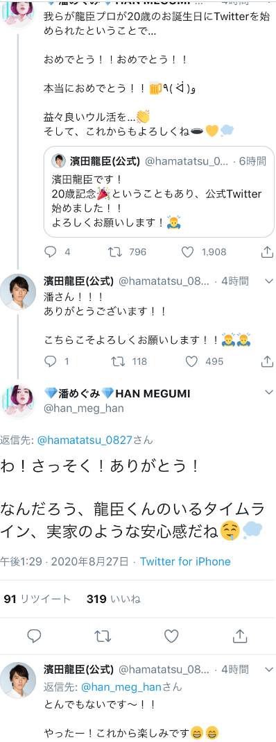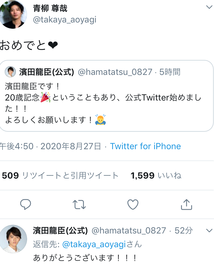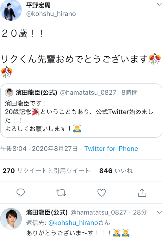 ちなみにタイタスとフーマはタイガとズッ友だから違和感ないよ龍臣プロの誕生日&Twitter開設を色んな俳優や女優から監督までお祝いしてるの見てるのなんか良いな...