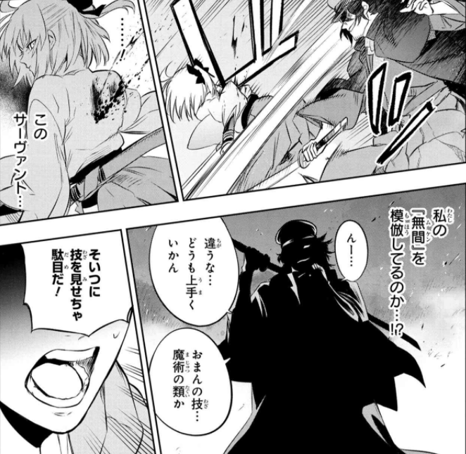 だがそれだけなら差は埋まらない。沖田さんも人斬りだ。問題はもう1つ。ダーオカの生前、沖田さんはまだ蝕まれていない!!ほほう。歩法を模倣とはやりますな以蔵さん。