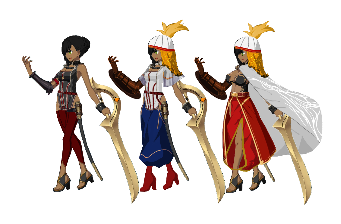 巴さんの衣装って水着以外はゲームの衣装モチーフらしいが……果たして?何故かはわからんが、踊り子には広刃の曲刀というイメージがある