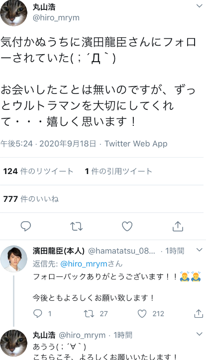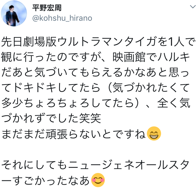 タイガの劇場版観に行ったら、上映前に配布ポストカード見てちびっ子が「ギンガだ!」「オーブ!」って嬉しそうに会話していた。タイガから復帰した自分より遥かに詳しいなと思いながらも、楽しそうなちびっ子に微笑ましい気持ちになった。今もウルトラマンが若い世代に愛されているの感慨深い。https://mobile.twitter.com/kohshu_hirano/status/1305895659015254016