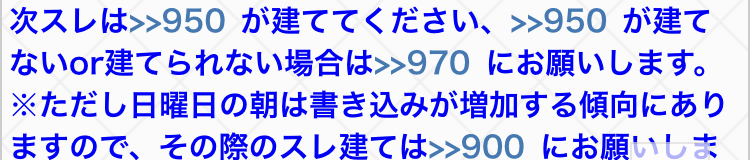 ※ただし日曜日の朝は書き込みが増加する傾向にありますので、その際のスレ建ては>>900にお願いします。承認後は早急に前スレを埋めてください。