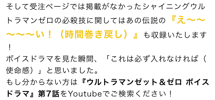 ※ウルトラマンジードではウルティメイトブレスレットが破損しており、本商品にセリフを入れると齟齬が出る、また、過去、「DXウルトラゼロアイNEO スペシャルver.」にジード内の音声が収録されている為、今回は外させていただきました。