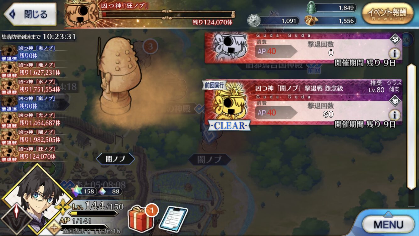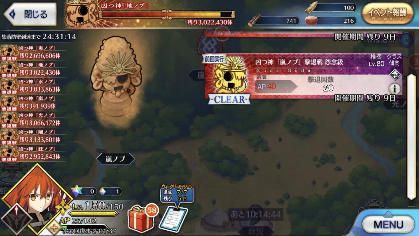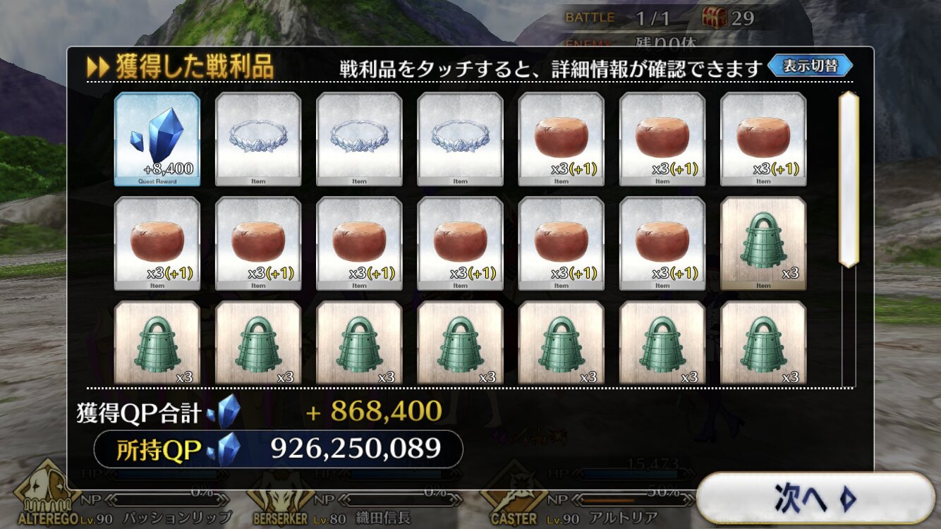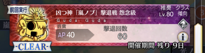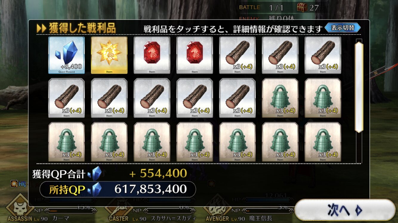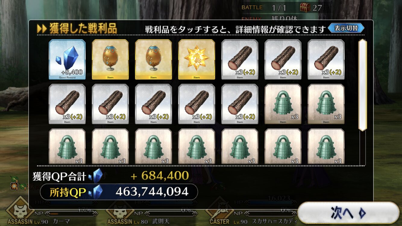 個人的に最優先は卵だが、その次は涙と心臓、根で迷うなとりあえずカッツを燃料に狂ノッブでアツモリして吹っ飛ばしてるんだけど、カッツでの火力アップすんごいな……
