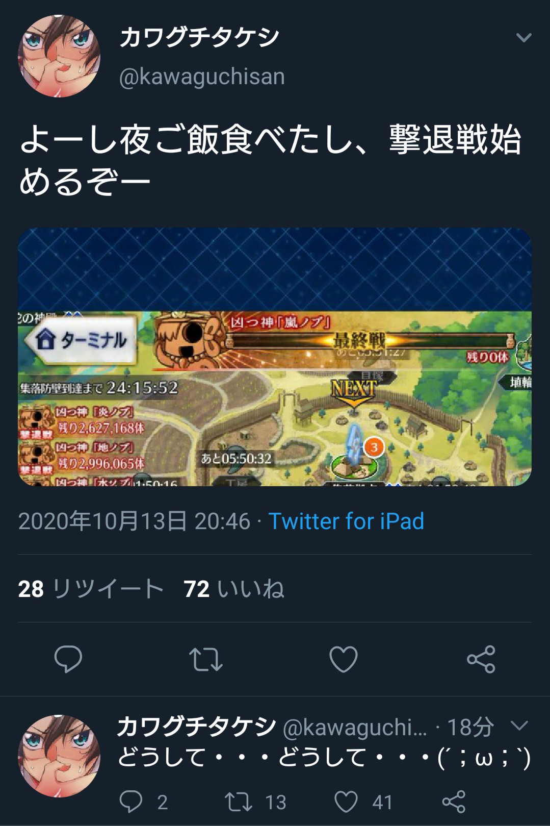 本気で全討伐させるなら初期タイマーを土日かかる時間にした上で各500万位にしときゃ良いだけだろうし、カッツの起死回生の策炸裂するか坂本さん組が夕方辺りに足止めできる情報持ってくるかするんじゃろうなぁとは思ってる