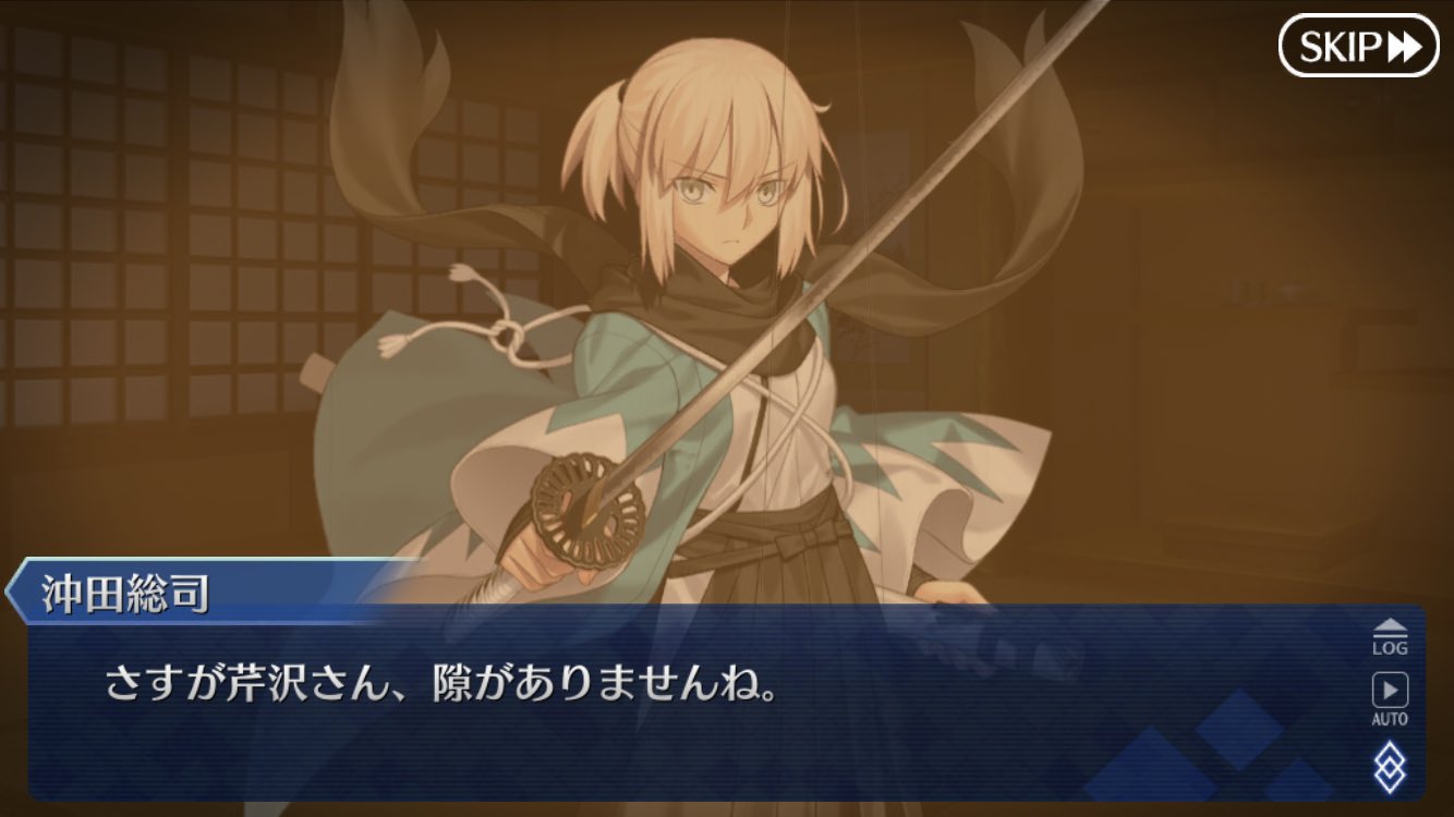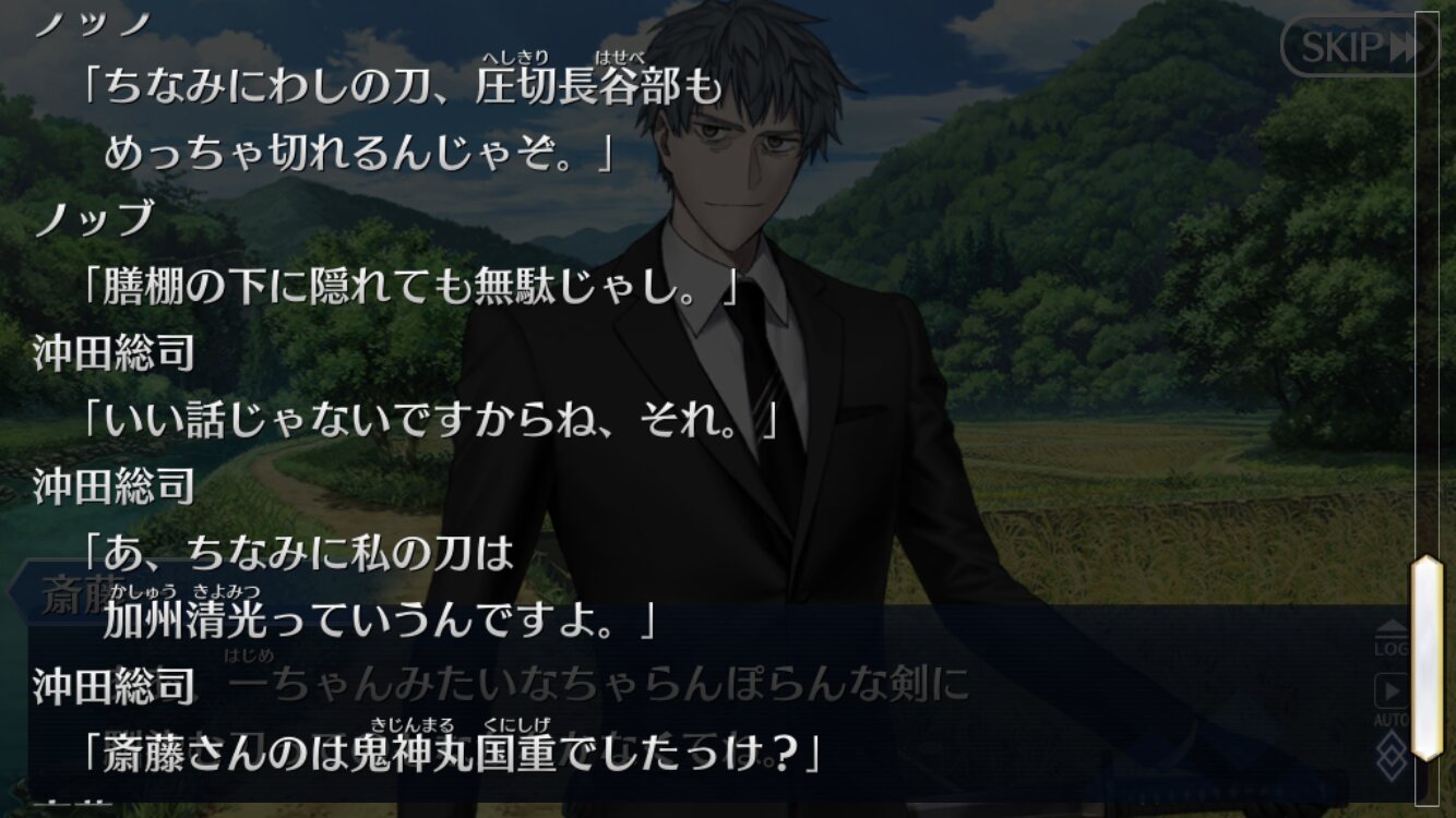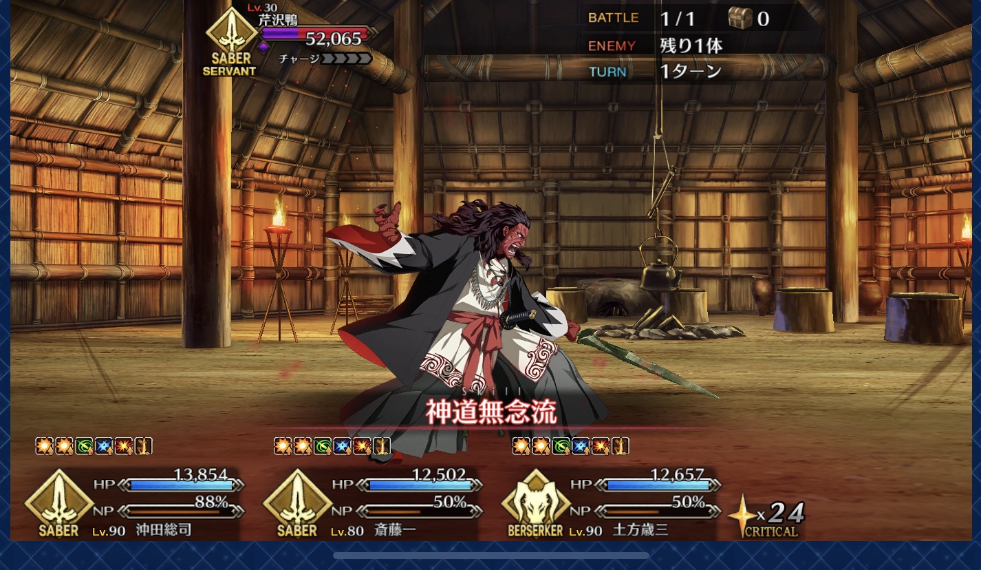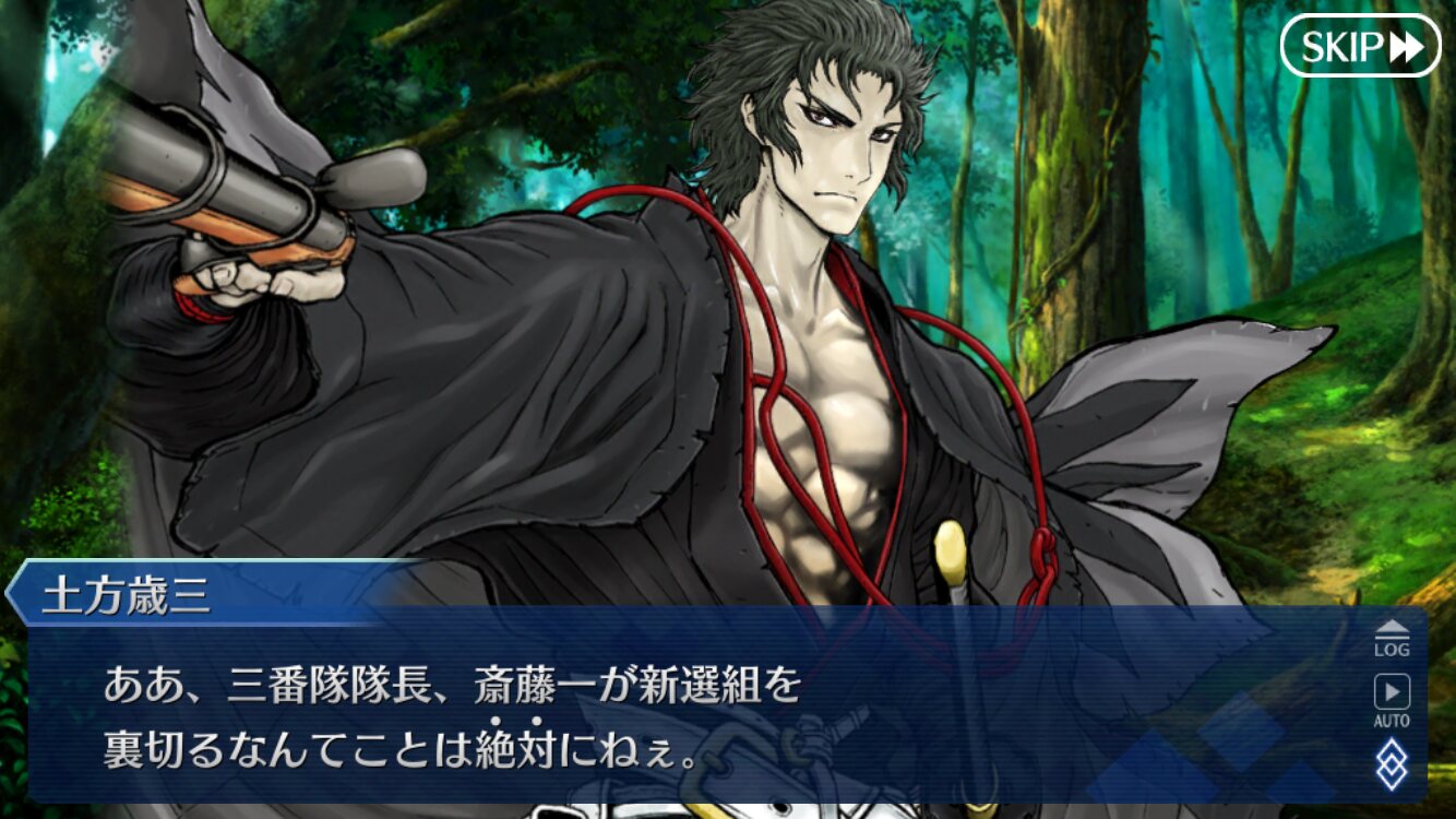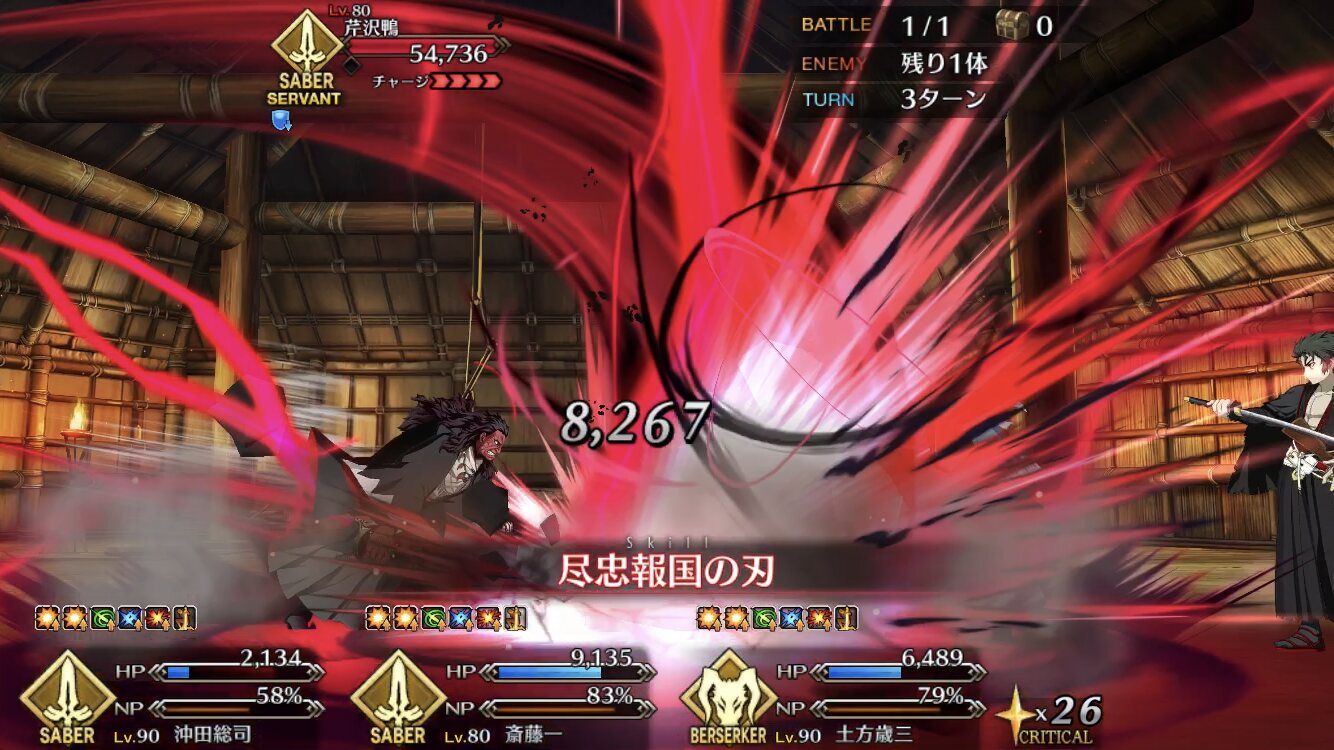僕鯖でも斎藤一のキャラつけはるろうに剣心か一刀斎夢録から脱することができなかった自分としては、一ちゃんのキャラつけに脱帽したよ。わがまま言えばNPC固定バトルに持っているキャラが該当した場合自キャラ選択させてほしいな、くらい。アンケートあったら忘れずに書いとかないとな…