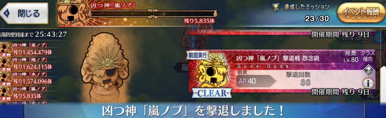 嵐ノブ2体しかやれなかったんだよなあがちで、レイド失敗したらどうなるか見たいので、砕かないでほしいわ