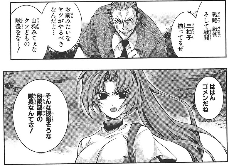 迅速に効率よく判断するために作戦は立てるんだ「おめぇ、……戦略、戦術、…そして戦闘、…全て三拍子揃ってるぜ。 ……お前みたいなヤツが俺の役をやるべきなんだよ…。山狗みてぇなくそどもの隊長をな…!」