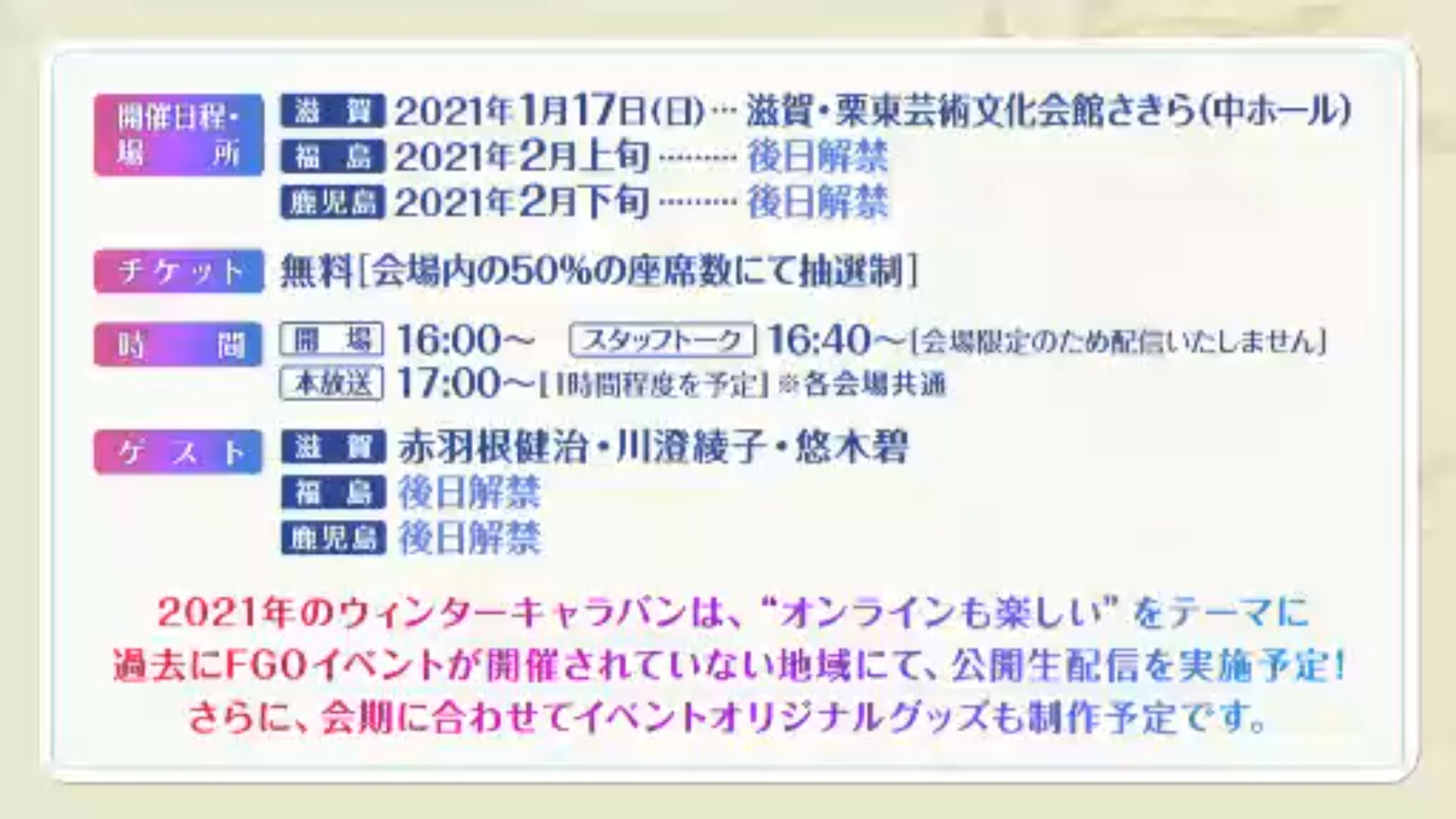 https://bbs.demonition.com/board/6222/Fate/Grand Order ウィンターキャラバン オンライン 2021 滋賀会場