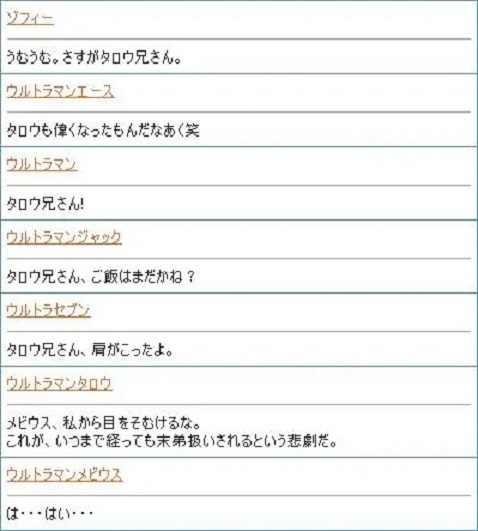 >>80タイガは実はメビウスをお父さんと仲良しのお兄さんと思ってそう。(一番舐められるポジ)