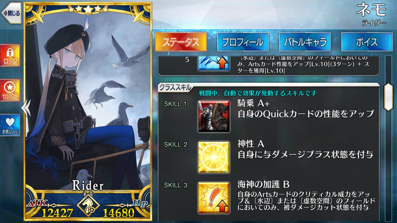 防御アップ、ダメージカット、無敵、相性不利無効化と守りは中々の物だしNP付与もあって良い
