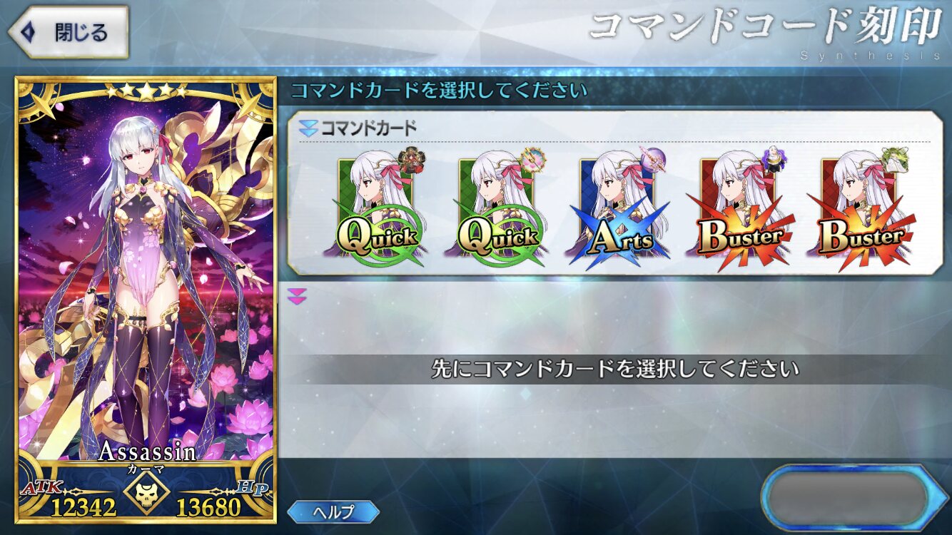 全体NP20配布を活かすために、第一スキルはスキルマ推奨。手持ちの概念礼装と配られるコマンドカード次第になるものの、A宝具サナトクマラのアーツチェインも含めれば1ターンで他者にNP40を与えられる。
