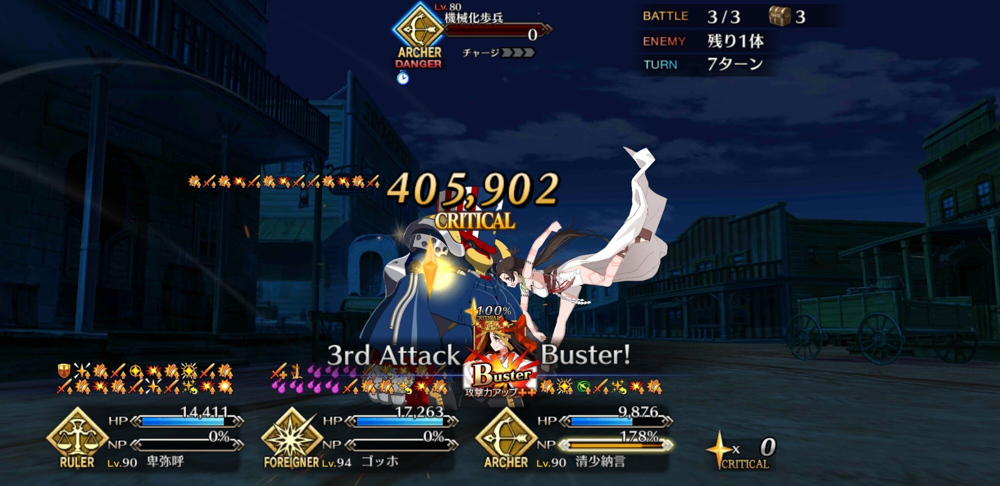バスターバフとクリバフはどちらも+100%だから乗算で4倍の火力になる、相性等倍分を差し引いても2倍火力ってのは大きい