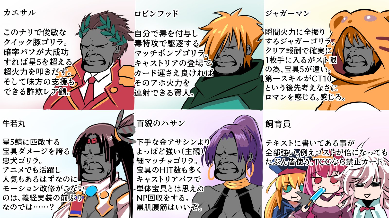 エルキドゥの変容も3色バフにしてしまっていいのでは?あと宝具の色変更卑弥呼さんとかいうゴリラの力を得たゴリラ飼育員その2