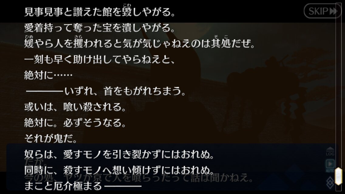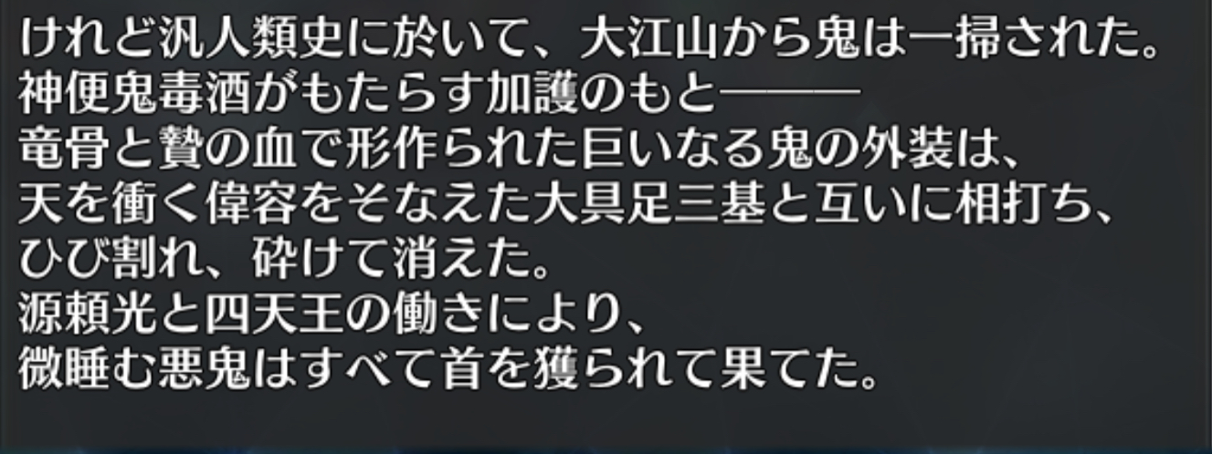 本編の描写とクラスごとの性格を見るに、セイバーの頼光をみたら「そうそうこんな感じ」ってなりそうラストの道満はなんかzero言峰を思い出したわ