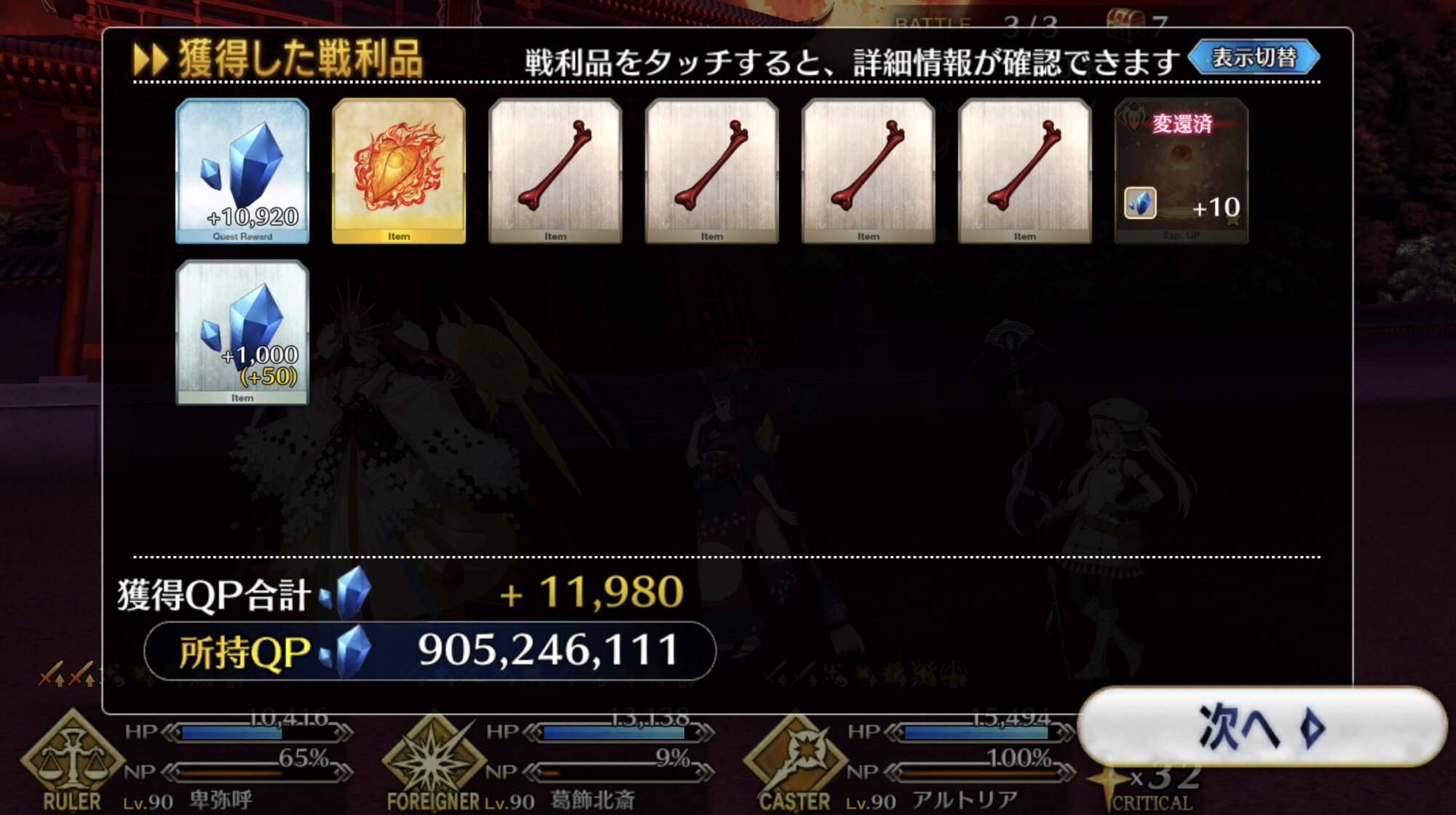 余った霊脈石一個一億QPくらいで交換できないかなぁ現地の玉藻って尻尾の数的にどっちかの陣営についたら一気に形成傾くレベルの強さなのかな