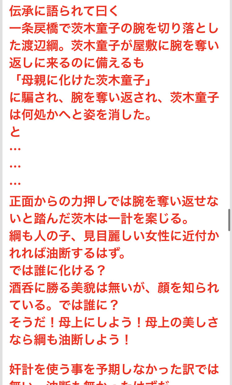 茨木が逃走の術に長けているのもあるんだろうけど大江山、羅城門、一条戻橋で撃退しながらも大きな傷を負わせるには一計を案じる必要があったというのが伺える……>>919
