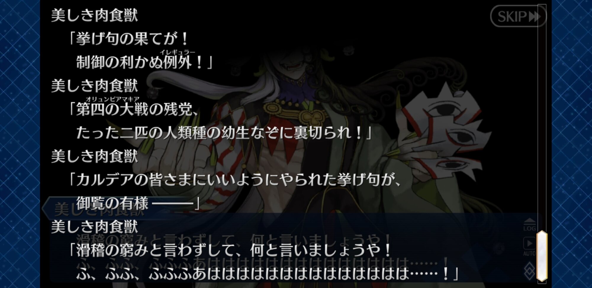 ここまで散々悪役やって、ぐだがカルデア帰ってきて綱呼べるかもと召喚したらリンボが出てきた時を想像したら笑いが止まらん。