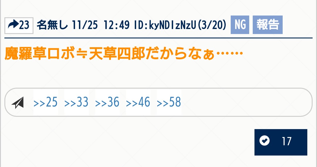 魔羅草ロボ……流石はでもにっしょんCh.FGO雑談スレといったところか。まさか、島原の乱において一揆衆がポルトガルの聖堂教会から譲り受けた聖遺物のひとつにして、起源を遡ればギリシャの機神より分かたれた奇跡の欠片とも謳われるあの決戦兵器を知る者がいるとは。籠城戦の最中、幕府軍への起死回生の一手として起動を試みるも、それがもたらす災禍を危惧した天草四郎時貞が引き止め、ついに日の目を浴びることのなかったものだ。